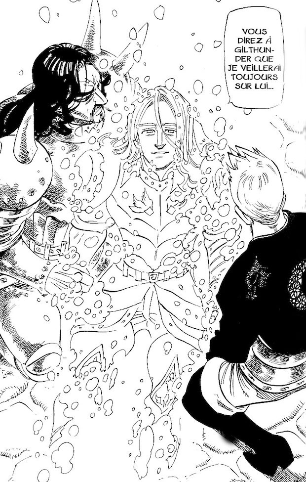 Certes, Fraudrin est celui qui a tué Liz, l’ancienne réincarnation de Elisabeth, mais ça n’excuse pas la malice du capitaine. La preuve —> Lui-même est effrayé et a besoin d’être réconforté par Elisabeth. Mais pour revenir à Fraudin, quelle surprise de le voir renoncer à sa vie pour sauver celle de Griamore ! À force d’avoir vécu dans le corps de Dreyfus, le Commandement de l’Altruisme a fini par s’y attacher. Il est assez loquace de voir que dans ses derniers instants, Fraudrin fut plus humain que Meliodas. Ce qui ne rattrape en aucun cas ses crimes passés, évidemment. Quid de Zaratras ? Bien qu’il ait permis à Dreyfus de récupérer son corps, je dois admettre avoir été déçu par sa courte prestation ! En qualité d’ex-commandant des Chevaliers Saints, je m’attendais à plus de puissance d’un tel personnage ! Tant pis. Ha ! Et on en parle de la résistance inouïe de Mama X Hawk ?! Ils sont indestructibles ces deux-là ahah. Tant mieux !!!