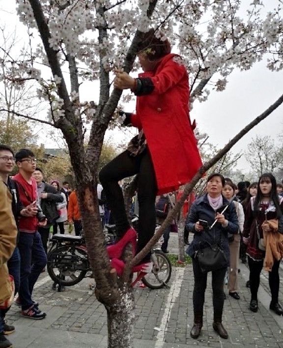 Pour dire à quel point le problème est réel : le gouvernement chinois lui-même commence à retirer le visa des touristes offrant une mauvaise image de leur pays depuis mai 2015 ! Chose qu’il ne peut pas faire lorsque les dits-comportement ont lieu à l’intérieur de ses villes comme c’est le cas, ici, de Nanjing. À savoir qu’un groupe de touristes débarquant de Pékin s’est amusé à monter sur les cerisiers fraichement éclos et à les secouer/frapper dans tous les sens histoire de décrocher le meilleur selfie possible -_- Les photos ont suscité un scandale pas possible sur Weibo —> preuve que la majorité des chinois se désolidarisent de ces « nouveaux riches » se croyant tout permis.