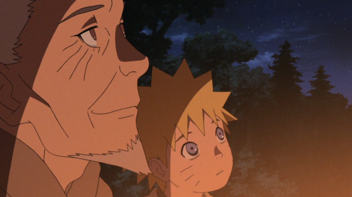 Pour autant, nous allons à nouveau nous projeter dans le passé. À l’époque où Naruto n’était qu’un enfant et rêvait d’être l’hokage du village. À cette époque, tout le monde le rejetait parce qu’il était l’hôte de Kyuubi. Soit le renard à neuf queues responsable de la destruction du village il y a quatre ans. Et pour des raisons aussi fallacieuses qu’atterrantes, beaucoup de villageois s’étaient persuadés que le 4e était mort par la faute de ce gamin. D’où une mise à l’écart du petit Naruto qui dût apprendre à vivre par lui-même…malgré ces apparitions saugrenues du « Vieux bouc » -_- Naruto apprendra par la suite qu’il s’agissait du 3e hokage, le Sandaime Hiruzen Sarutobi. Et que ce dernier avait promis à son père qu’il veillerait secrètement sur lui. « Merci, vieux bouc ! Merci pour tout ! ».