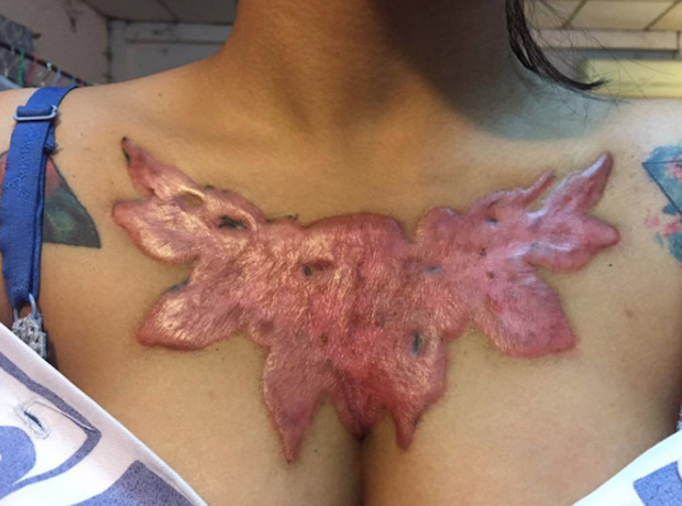 Clairement —> Sandra aurait dû aller voir un médecin dès les premiers picotements. Lorsqu’elle réalise avec effroi que le motif s’effrite et que sa peau se liquéfie, il est trop tard. D’où ces prescriptions évidentes mais qui ne sont parfois pas respectées —> Si, après la pose d’un tatouage, la zone concernée subit des rougeurs et émet des sécrétions/mauvaises odeurs, c’est qu’il y a un problème ! Consultez d’urgence un médecin. Au final, Sandra s’en sortira avec une grosse brûlure/cicatrice. « Le tatouage n’est pas une pratique à prendre à la légère, Pensez à confier votre peau à un tatoueur de confiance si vous souhaitez avoir un beau tatouage qui dure dans le temps ! » ajoute Nhà Báo. Si vous ne retrouvez pas ces conditions chez un dit-tatoueur, patientez jusqu’à ce ce que ce soit le cas. Il s’agit de votre corps et de votre santé. Ne prenez pas la chose à la légère.