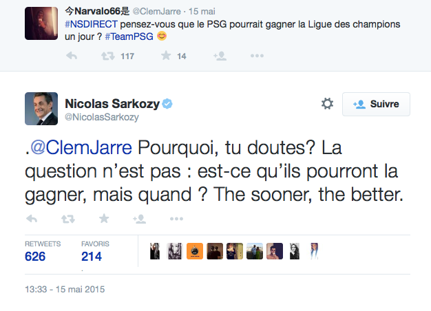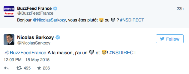 Au moins, il sera resté dans l’esprit de Twitter : léger, bon enfant…et un peu vide. Mais pas tant que ça. C’est lors d’une session de questions/réponses sur Twitter que l’actuel président de l’UMP, Nicolas Sarkozy, s’est proposé de répondre aux interrogations les plus sérieuses et les plus pertinentes de la twitosphère. Comme savoir quelle étaient ses séries préférées ou s’il est plutôt Chien ou Chat. Aucun doute, nous sommes bien sur Twitter \o/