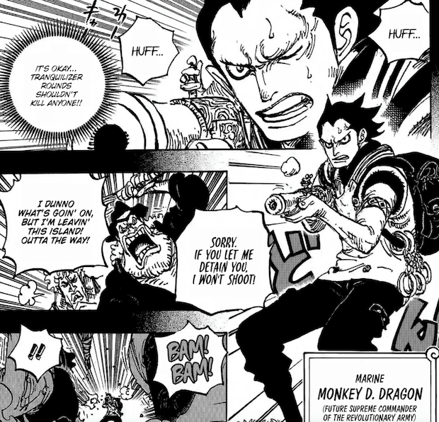 C’est moi ou on s’apprête à assister à l’un des plus grands chapitres de tout One Piece ? Fichtre, quel flashback MONUMENTAL ! J’ai encore du mal à réaliser que nous allons enfin savoir ce qu’il s’est passé sur l’île de God Valley. Le grand prix de la Grande Chasse était donc Shakuyaku. Il y a probablement un traitre parmi l’équipage de Rocks. Suffisamment puissant pour avoir pu tuer Don Marlon et d’autres pirates. On apprend également que c’est elle que souhaitait épouser Saint Figarland Garling et qu’il est bien le père de Shanks et Shamrock. La femme avec qui il a eu ces enfants n’était probablement qu’un passe-temps à ses yeux. Il n’a pas hésiter à la tuer après lui avoir annoncé que sa terre natal serait le théâtre d’un génocide. Tout cela pour le divertissement d’une poignée de monstres. Qui aurait pensé que Monkey D. Dragon faisait partie de l’escouade marine chargée de capturer les habitants de God Valley à cette époque ? Pas étonnant qu’il ait déserté juste après. Et c’est lui qui a sauvé Teach ! Après que sa mère mourante l’ai imploré de préserver au moins une vie. Fichtre, un tournant de l’histoire se déroule sous nos yeux.