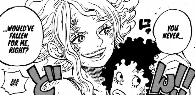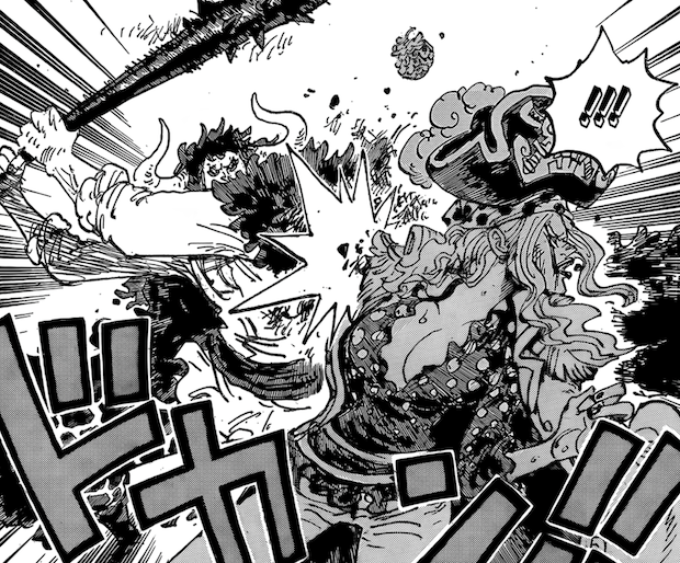 Mis à part cela, le courage de Eris nous est montré à travers son dévouement envers le clan Davy. Se refusant à mettre davantage en danger son mari et prête au pire si elle se retrouve acculée. Un autre évènement important montré dans ce chapitre est le vol du fruit Uo Uo no Mi de Kaido des mains de Big Mom. Dire qu’elle voulait le passer à son fils, Katakuri, ahah. Je ne sais pas pour vous mais ça me convainc encore plus d’un retour de Linlin. Kaido a clairement une dette non payée envers elle et celle-ci pourrait se payer via l’offre de son âme. Pour conclure, nous voilà avec un triptyque culte ! Barbe Blanche, Xebex D. Rocks et Kaido sous sa forme de dragon face aux God Knights et une Imu semblant avoir pris possession de Saturn. Fichtre, quelle image ! Seuls face à l’incarnation du monde oppresseur. Remarquez combien Kaido apparait jeune et plein d’ambition lors de ce flashback. Que va t-il bien se passer pour le rendre alcoolique et dépressif par la suite ? Et cet homme qui ressemble à Marco serait-il son père ? Vite, la suite.