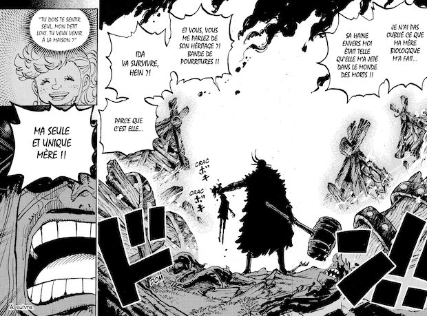 Et nous voilà revenu au flashback de Erbaf. Avec une triste nouvelle puisque ce chapitre confirme la mort de la douce Ida. Laquelle aura été aimée de toutes les belles âmes du pays. Dont Loki qu’elle aura aimé comme son propre fils. Rappelons que c’est grâce à sa générosité et son courage eu égard aux malfrats de tout genre (dont faisait partie Harald) que les géants ont pris un nouveau virage. Davantage de tolérance et un effort commun pour une tentative de réconciliation et d’entraide avec les autres pays du monde. Bien sûr, Imu n’en avait que faire. Tout ce qu’elle (il) souhaitait, c’était mettre la main sur une armée de géants. Le fait que Harald n’ait pas entendu les avertissements de son meilleur ami, Xebec, a de quoi faire grincer des dents. S’agissait d’une douce naïveté de sa part ou d’une volonté de racheter ses péchés ? Et comment a t-il pu croire que le Gouvernement Mondial était digne de confiance ? Après tout ce qu’il s’est passé ? Ha, je comprends que certains fans soient agacés par le personnage. Tout ça aurait pu être évité.