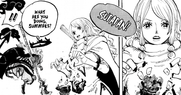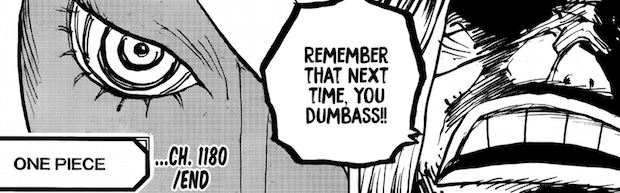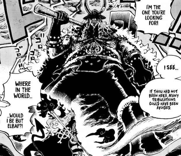 In.cro.yableeee ! La puissance de Saint Nerona Imu était attendue au tournant et, fichtre, il ne déçoit pas ! Une véritable démonstration de force. Que ce soit à l’encontre des géants qu’il balade comme de simples fétus de paille ou des cadors que sont Zoro X Sanji. Balayés aussi bien l’un que l’autre par un simple éclat de flamme noire, Omen, ou banal coup de pied. Et m’est avis que Luffy et Loki vont subir le même sort. Mais pas aussi rapidement ! Et cela signera à la fois leur victoire et leur défaite ! Rappelons que Imu est dans une course contre la montre et qu’il ne peut se permettre de gaspiller la moindre seconde sur Elbaf. Il est probable que Imu domine Loki X Luffy mais qu’il ne parvienne pas à leur donner le coup de grâce. Je suis à peu près certain qu’il n’arrivera rien de dommageable à Elbaf et que le Gouvernement Mondial repartira benêt de cette tentative de soumission. Pour autant, les mugiwara et les géants auront eu la confirmation qu’il existe une entité bien plus puissante qu’eux.