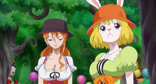 « Kyaaaaaa !!! ». Il semblerait que Nami, Chopper et Carrot soient tombés sur un bien curieux personnage ! Et effrayant qui plus est !! « Un géant enterré à moitié ToT » se lamente Nami ! « Mais pourquoi a t-il été enterré pour commencer ? » se demande Chopper. « Bah… Parce que j’avais envie ». Okayyy ._. « J’aime bien les jus de fruit sinon » ._. « Est-ce que vous pourriez m’en ramener ? » ._. Chopper est à deux doigts de se transformer en mode Monster. Mais l’heure n’est pas à la distraction ! Un lapin mousquetaire chevauchant une cigogne est à leurs trousses ! Et malgré une folle envie de Carrot de lui fermer son museau, la priorité est de retrouver Sanji !! Mais comment ? Nos amis ne sont mêmes plus certains que le Sanji qu’ils ont aperçu était le vrai -_-« Cette forêt est tellement étrange… Entre les arbres qui parlent, les crocodiles au chapeau melon et ce lapin fanfaron… « Je ne la sens pas cette forêt ! Je ne la sens pas du tout… » murmure Nami.