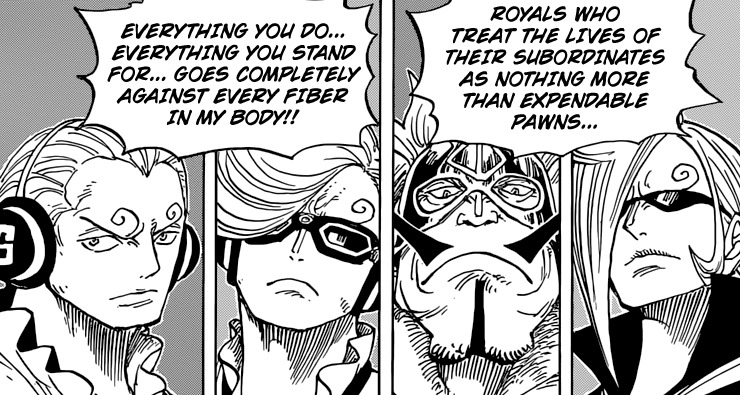 Damn ! Les frangins de Sanji sont aussi détestables que le père !! Notamment Niji qui non seulement gâche de la bonne nourriture mais FRAPPE une demoiselle sans défense au point de la rendre inconsciente !! Puis le décor de la salle à manger qui fait vaguement penser à l’architecture nazi ._. Tu m’étonnes que Sanji est parti en courant <_< Hâte qu’il remette à sa place son grand frère prétentieux comme pas deux ! Quoique, il me semble qu’ils sont tous jumeaux avec Reiju en grande soeur <_< D’ailleurs la fin du chapitre semble conforter une théorie des plus angoissantes —> Et si Sanji et ses trois bros n’étaient que des clones de leur père Jaji ? Ça expliquerait le fait qu’ils soient tous les quatre « frères jumeaux ».