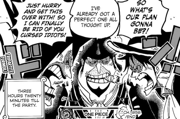 Ça fait longtemps que je n’étais plus devenu accro à One Piece ^o^ La dernière fois qu’un tel phénomène est arrivé remonte à la Bataille de Marineford ! Lorsque Ace et Barbe Blanche ont perdu la vie… Anyway ! Très bon chapitre avec une alliance Luffy X Bege X Caesar qui se dessine à grandes enjambées *_* Cette double page où la Team Mugiwara fait face à la Team Capone <3 C’est tellement stylé !! Et Luffy/Brook qui guérissent de leurs blessures en buvant du lait xD Tellement Oda… Par contre, j’ai un peu de peine pour Pekoms ! C’est le seul type à s’en faire pour Big Mama alors que tous les autres souhaitent la tuer ahah. D’où le fait que l’équipage de Jinbei fasse tout pour le retenir ! Ce qui est génial avec Oda-sensei, c’est qu’il arrive toujours à nous surprendre au bout de 858 chapitres !