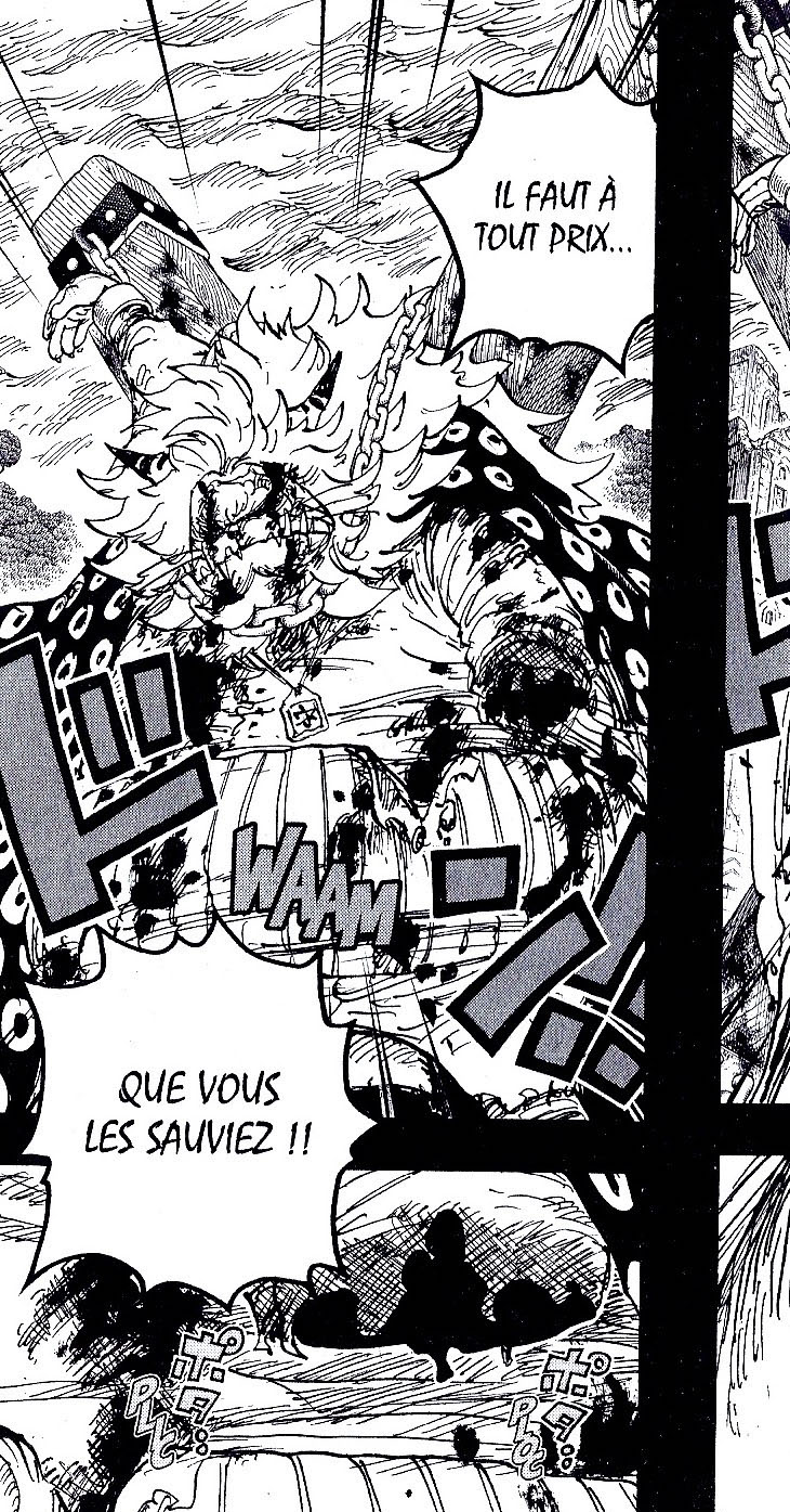 Mais pourquoi Jack s’est-il acharné sur les Minks ? Parce qu’il était persuadé que la tribu cachait un ninja nommé Raizo… Et cela en dépit des allégations contraires et répétées de nos amis hybrides ! La torture ira jusqu’au point que Maître Chapivère et Duc Caborage perdront respectivement le bras gauche et la jambe gauche T_T Et sans la victoire de la Team Luffy sur Doflamingo (qui force le retrait de Jack puisque Kaido se fournissait en Smiles chez l’ex-capitaine corsaire), qui sait ce qu’il serait advenu… Tout ça pour apprendre à la fin…que Raizo se cachait bel et bien sur Zo !!! « Nos ennemis peuvent détruire ce qu’ils veulent, jamais nous ne leur vendrons un ami ! ». Hooooooooo ToT J’ai l’impression que cet arc va être l’un des meilleurs en la matière depuis l’ellipse <3