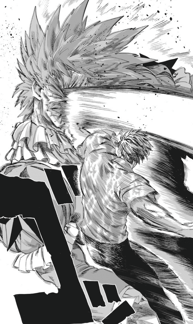 Pour autant, le héros N°1 A a montré pourquoi il se dressait au sommet de sa classe ! Admirez-moi l’enchainement fluide et parfait qu’il administre à Pesky Clown après avoir sauvé deux civils. Tout simplement impeccable ! Au point d’avoir éclaté ses trois « ballons de vie ». Hélas, j’ai l’impression que Pesky Clown a désormais atteint le rang de « Démon ++ » si ce n’est « Démon +++ ». Soit l’équivalent du Roi des Profondeurs qui était parvenu, à l’époque, à vaincre deux héros de rang S. Je suis à peu près certain que Saitama ne va pas revenir. Ce qui signifie que Sweet Mask va devoir se surpasser pour triompher d’une telle adversité. Cette idiotie collective ne saurait avoir raison de lui, n’est-ce pas ? Non, nous assistons à peine au début du character building de Beaut. Nous n’allons pas nous arrêter en si bon chemin. Allez, vite, la suite !