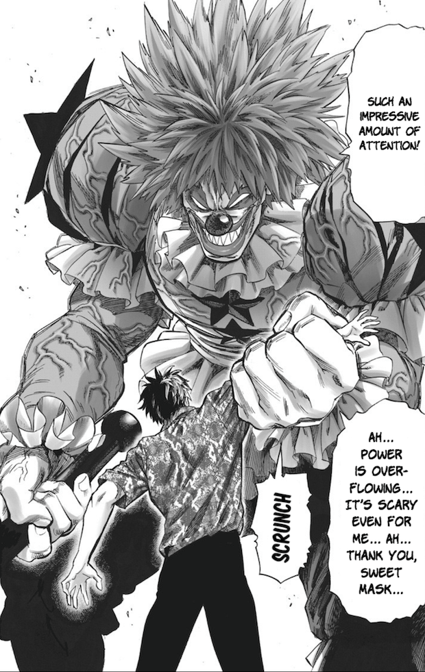 Fut un temps où je me serais dit que ces civils dans One Punch Man sont bien trop stupides pour que l’on y croit. Or, quand je vois l’état du monde actuel, je réalise que cette idiotie collective est en réalité très convaincante. Combien d’exemples de personnes qui, par effet de foule ou par bêtise profonde, se jettent délibérément dans la gueule du loup ? C’est exactement ce qui s’est passé avec ces civils, fans, ou pas, de Sweet Mask. Ce qui compte, c’est montrer aux autres qu’on est là. Ce qui compte, c’est de s’emparer de la moindre marque d’attention de celui qui captive les regards. Quid de l’instinct de survie ? Il n’y en a point. Et il va sans dire que ce lot de circonstances aggravantes va causer bien des déboires à Sweet Mask. Car face à lui se dresse un adversaire devenant plus fort au fur et à mesure que l’on porte attention à lui. Oui, ici, toutes les cartes sont réunies pour une montée en puissance drastique.