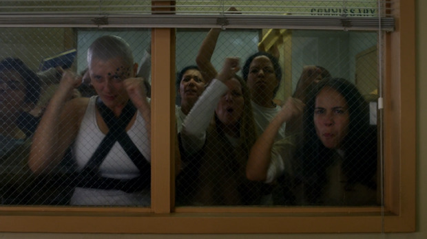 Maintenant que Tiff’ a permis l’évasion de Coates en lui confiant le pistolet, autant dire que la belle est devenue Persona Non Grata au sein de Litchfield u_u Heureusement que Big Boo est là pour lui servir d’avocat ! Non pas que cela serve à quelque chose vu la situation actuelle… À savoir une Judy Jones libérée et un Gouverneur Hutchinson qui…semble disposé à négocier avec les prisonnières de Litchfield ?! Wow ! C’est un bon début !! Du moins mieux qu’un Piscatella défonçant tout sur son passage… « Des Cheetos, des Takis et des Tampons !! Ils se conforment à nos demandes !!! » exulte Black Cindy ! Comme quoi Tasha a bien fait de parler en son nom au lieu de laisser Judy s’en occuper ! Se pourrait-il qu’elles obtiennent enfin Justice ? « Oui, il le faut… Pour Poussey ».