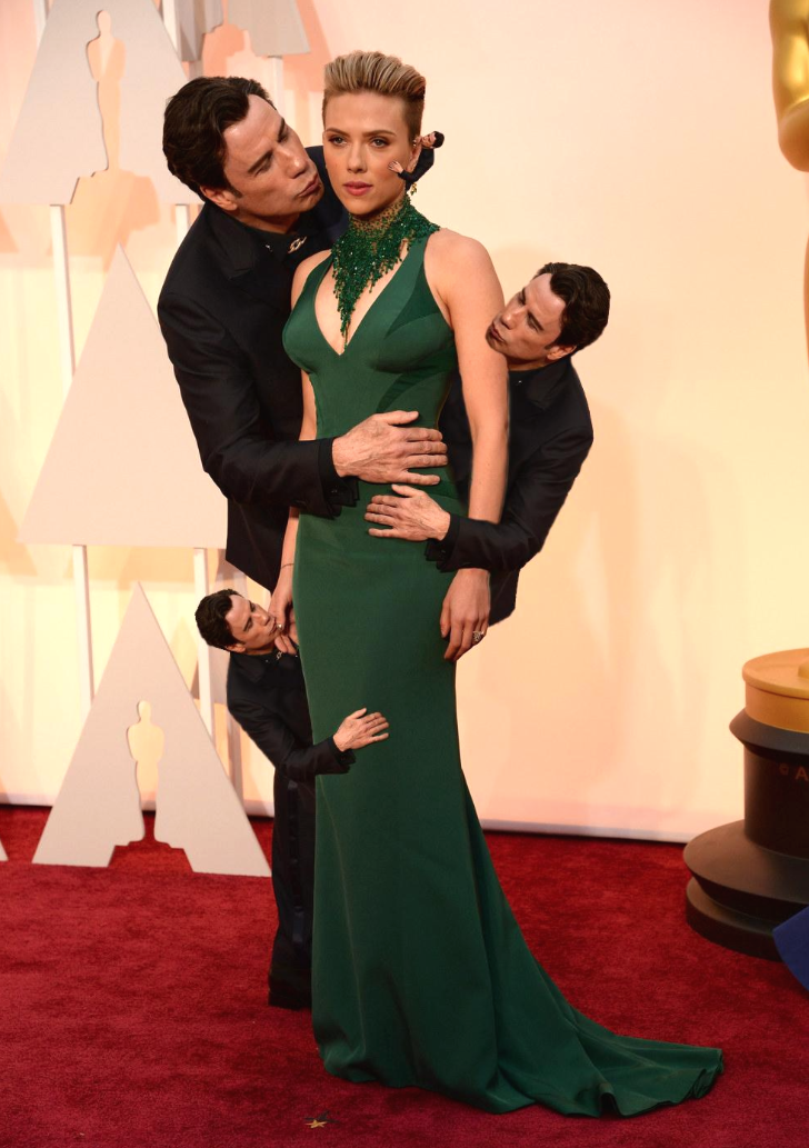 Quelque chose me dit qu’elle ne souhaitait pas vraiment être embrassée. Qui plus avec une main délicatement posée sur son ventre X_X Sérieusement, depuis quand John Travolta est-il devenu aussi creepy ? L’awkward moment s’est produit hier lors de la 87ème cérémonie des Oscars : Scarlett Johansson, accompagnée de sa coupe « Half Hawk » et de son mari, défile sur le tapis rouge et se prête au jeu des photographes. C’est à ce moment précis que surgit le Travolta sauvage.