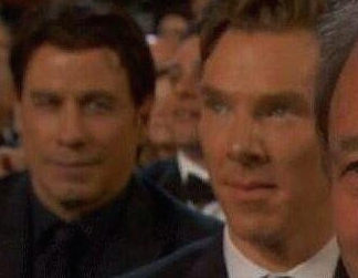 Celui-ci l’enlace alors par la taille et lui délivre un baiser aussi malvenu que flippant. En fait, s’il fallait définir là, ici, tout de suite, le harcèlement sexuel, je n’aurais qu’à publier cette photo. On imagine que le mari de Scarlett, Romain Dauriac, a particulièrement apprécié l’instant. Et si seulement John s’était arrêté là…mais non, il a fallu qu’il TOUCHE le visage d’Idina Menzel (à moins qu’il ne s’agisse d’Adele Dazeem ?) et regarde avec insistance Benedict Cumberbatch. Brr x_x