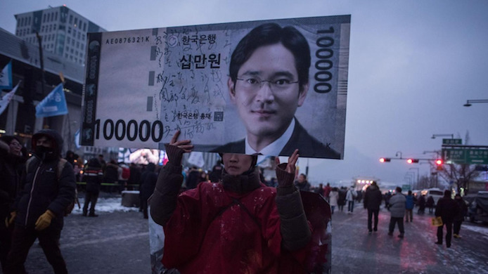 Ce qui lui est reproché —> Avoir pris part au plus gros trafic d’influence et de corruption qu’ait connu le pays depuis sa création en août 1948. Un scandale qui a déjà eu la peau de l’ancienne présidente, Park Geun-hye, et qui se prépare à en faire de même pour Jee Jay-yong. Plus précisément, celui-ci aurait reversé d’importants pots de vins à la présidente et sa conseillère Choi Soon-sil (également arrêtée) afin de bénéficier d’arbitrages favorables dans plusieurs litiges. Des litiges industriels et financiers qui l’opposaient à d’autres entreprises ou différentes associations (protection des consommateurs, protection de l’environnement, etc). L’arrestation de Lee Jay-yong est en outre motivée par la préoccupation de ne pas le voir quitter le pays. Depuis 2014, cet homme de 48 ans avait pris la succession de son père, Lee Kun-hee, suite à une crise de cardiaque. Depuis, l’ancien patron de Samsung semble toujours être hospitalisé (potentiellement dans le coma). Wow…