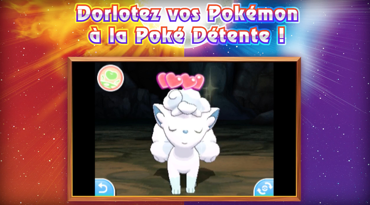 En forme Diurne, Lougaroc dispose d’une capacité signature qui lui permet d’attaquer en priorité quoiqu’il arrive ! En forme Nocturne, Lougaroc pourra infliger le double de dégâts avec « Riposte » si son adversaire administre une attaque physique (⌐■_■) Mis à part cela, on notera une capacité Z unique à Pikachu et à Evoli qui, tel Sangoku, invoque la puissance de ses huit évolutions !! Résultat –> Un boost de deux niveaux en attaque/défense/attaque spéciale/défense spéciale/vitesse *o* Wow ! Ça, c’est du boost ! Cerise sur le gâteau —> Les choix de personnalisation seront encore plus étoffés que dans X/Y ! De même, la possibilité de chouchouter son Pokémon se verra améliorée grâce à un nouveau service nommé Poké Détente \^o^/ Ha, si seulement on pouvait se promener à coté de son Pokémon…