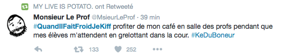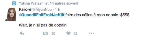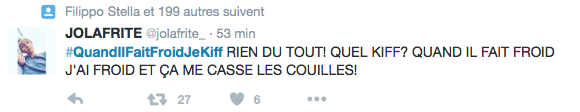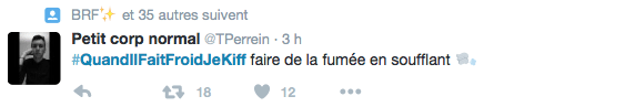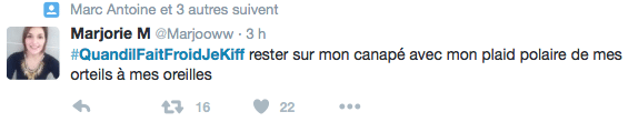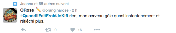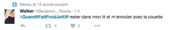 Autre chose que j’adore faire lorsqu’il fait froid –> Boire du chocolat chaud *o* Par contre, je ne comprends pas le délire qu’ont certains à regarder des séries emmitouflés dans une couverture ou un plaid. Suis-je le seul à trouver ça HYPER inconfortable ? Moins j’ai de choses sur moi, mieux je me porte. Oui, je suis un nudiste (même si je garde un boxer). Sur ce, préparez-vous mentalement à douiller car l’hiver est ENFIN arrivé *o* Si seulement on pouvait avoir de la neige…