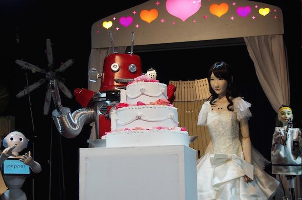 Attaquer l’actu du Japon un lundi matin, c’est toujours un peu violent. Même si on se doutait tous qu’un mariage entre robots allait arriver un jour ou l’autre <_< Mais aussi tôt ?! Je pensais qu’on allait au moins attendre les premiers robots à intelligence artificielle avancée avant d’organiser ce genre d’évènement -_-‘ Anyway, Frois le robot blender et Yukirin l’androïde nipponne ont scellé leur union dimanche dernier à Tokyo en coupant à deux leur gâteau de mariage <3