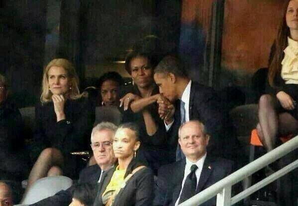 C’est un moment assez épique qui s’est passé durant la commémoration d’hommage à Mandela. Obama discutait tranquille avec la première ministre danoise, Helle Thorning-Schmidt, lorsque celle-ci eut l’idée de faire un selfie. Aussitôt dit, aussitôt fait, et avec une incruste de David Cameron à la clé. Problème : tous ces petits jeux de flirt ont eu le don de particulièrement agacer Michelle qui, quelques minutes plus tard, a fini par échanger de places avec son mari. Changement radical d’ambiance…