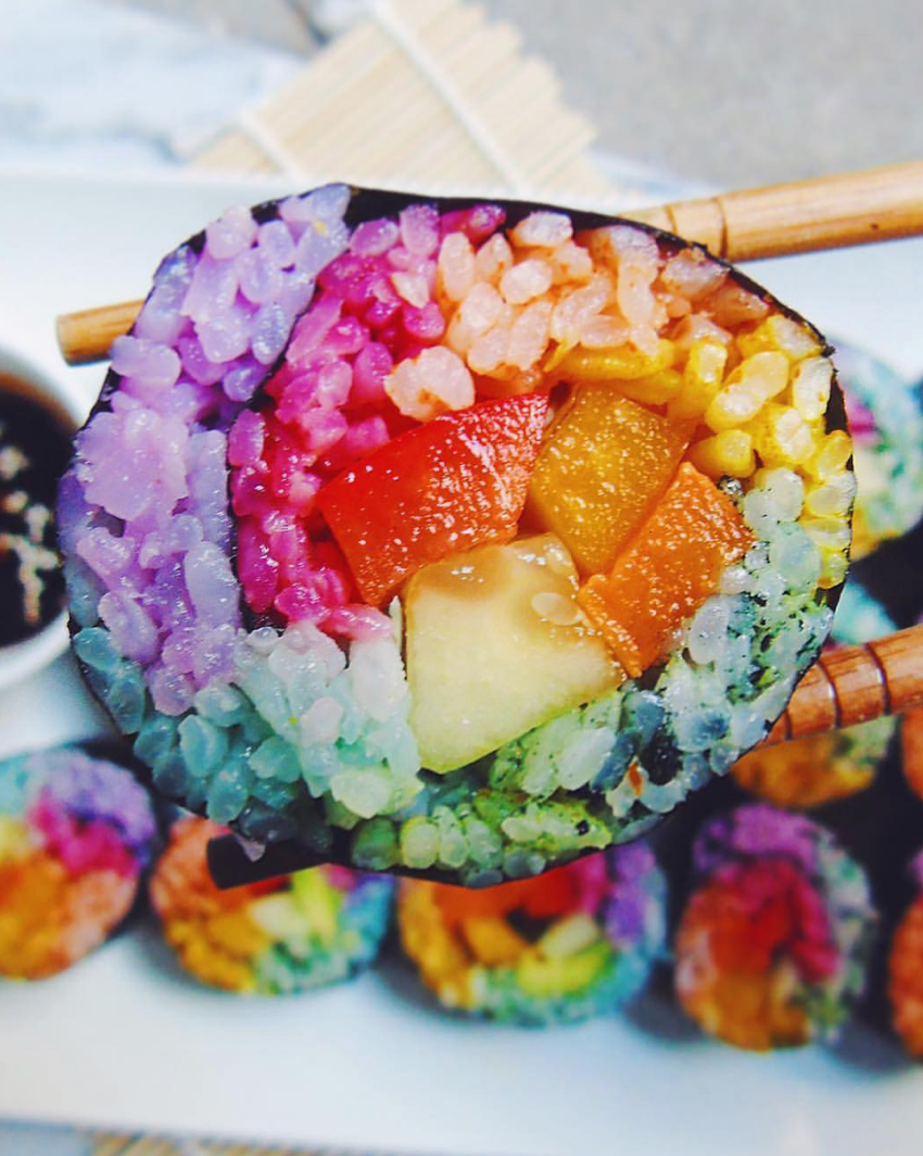 Rien de tel qu’une fournée de rainbow sushi pour repartir du bon pied <3 Pourtant, le goût reste le même vu qu’il s’agit seulement de colorer les grains de riz ! Objectif : former un joli arc-en-ciel \^o^/ Et pourtant, le visuel est une variable extrêmement importante dans l’appréciation d’un plat ! Notamment parce qu’il permet de susciter l’envie en plus d’accroitre le plaisir de dégustation grâce à la puissance de l’imagination ლ(╹◡╹ლ) Pour peu que les sushi soient de qualité, évidemment ! Et pour les curieux, les rainbow sushi n’ont pas vraiment la côte au Japon mais plutôt en Europe et aux US d’où le concept a été lancé.