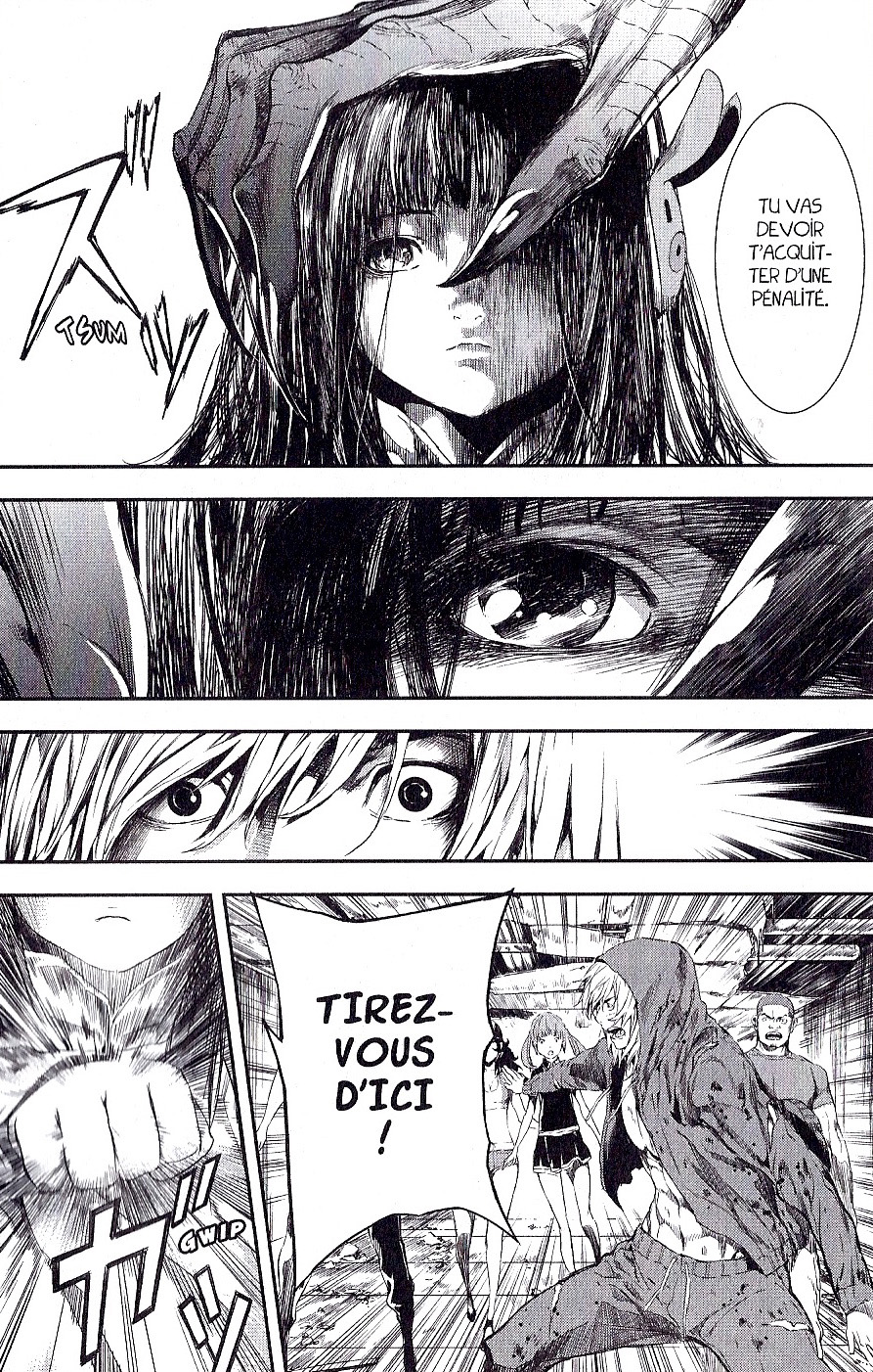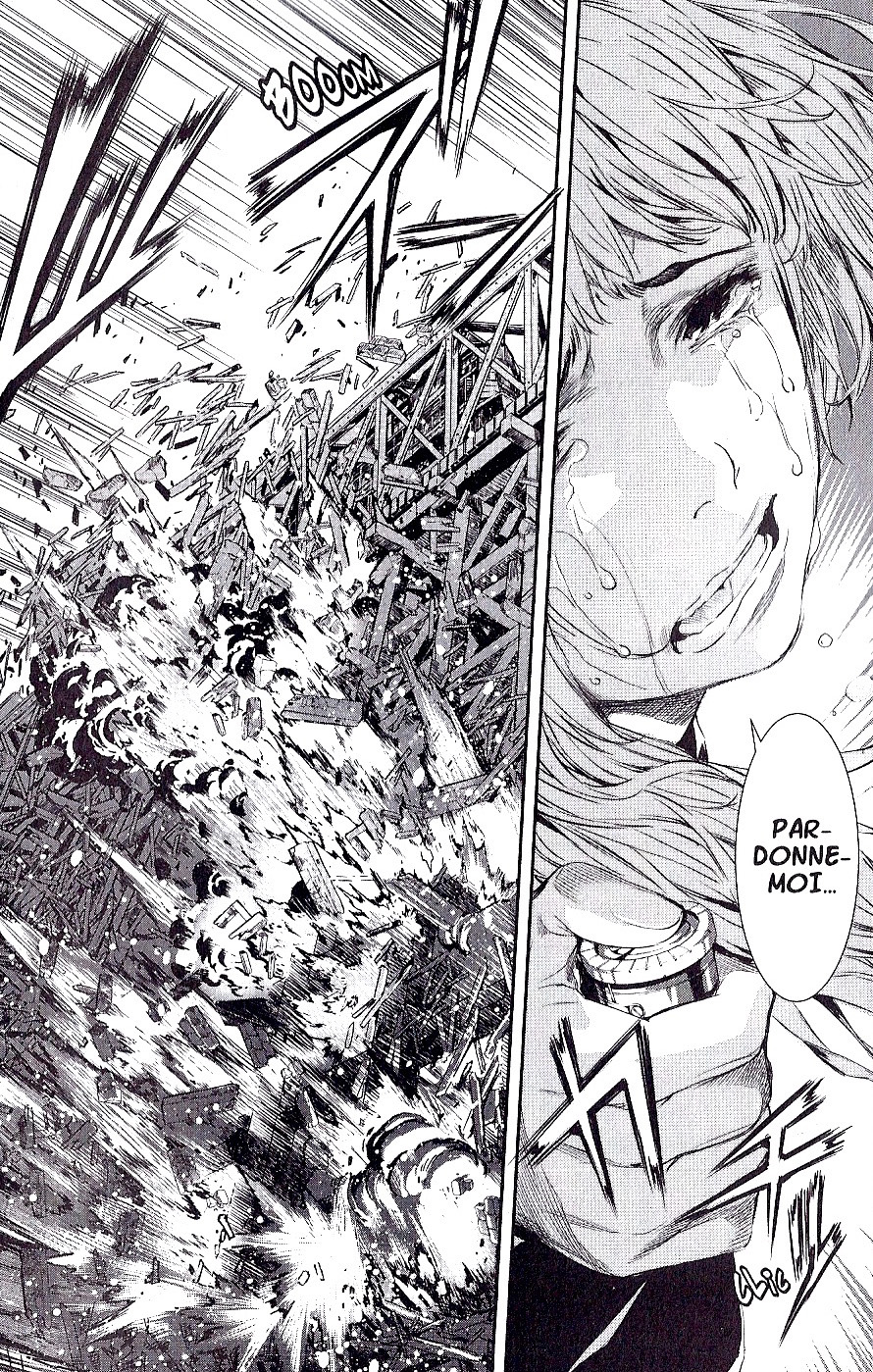 Enfin, troisième et dernier point, le plus impardonnable à mon sens : Area D dispose d’un ***** de scénariste. Ce que n’a pas Mashima qui parvient pourtant à mieux s’en sortir. À quoi joue donc Kyouichi Nanatsuki pour délivrer une histoire aussi sommaire et des personnages aussi plats et stéréotypés ? Avant même d’ouvrir le tome, je savais que Mika allait être sauvée et que Jin allait triompher de Owl-Eye. Le tout sans aucune drama, évidemment. De fait, il n’y a que le cliff nous dévoilant que les deux chefs des districts Est et Ouest, Kidô et Asura, sont toujours vivants, qui m’a plu (même si je m’en doutais fortement pour Kidô). Quant à celui clôturant la première partie, inutile de préciser que Rin va s’en sortir -_- En espérant que le deuxième arc soit plus couillu…