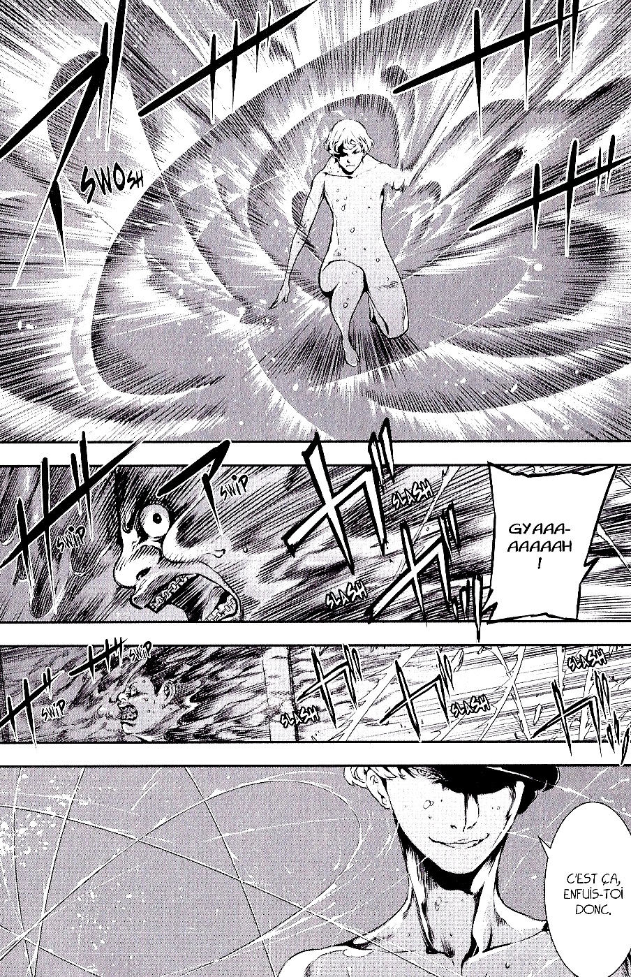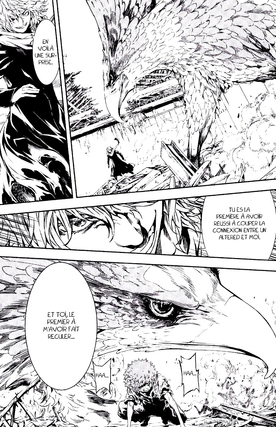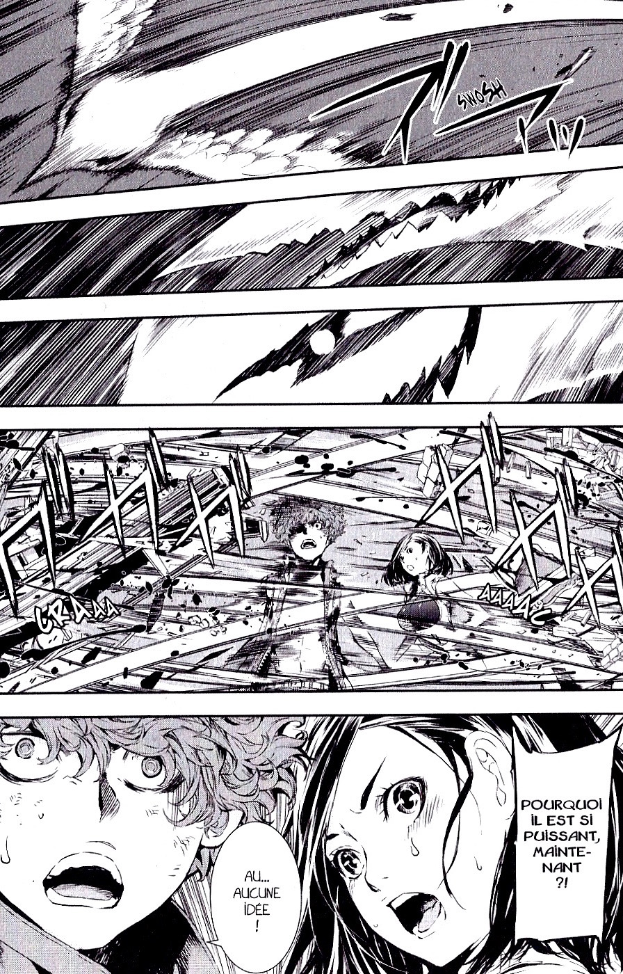 Alors que Ryô Kazama s’apprête à être tué par son opposant, voilà que son pouvoir se manifeste enfin ! Un pouvoir qui se présente sous la forme d’un oisillon aux dents acérées…et quelque peu inutile -_-‘ Tellement inutile que le patapouffe meurtrier décide de le relâcher pour s’en prendre à Mari et Kai ! Mais l’homme aqueux a plus d’un tour dans son sac et entend bien en finir avec son opposant ! « Hey ! Gros lard ! C’est moi qui ai tué ta soeur ! Maintenant, c’est à ton tour ». C’est le moment ou jamais pour Mari et Ryô de fuir ! Tant bien même celui-ci enrage de ne pouvoir rien faire…