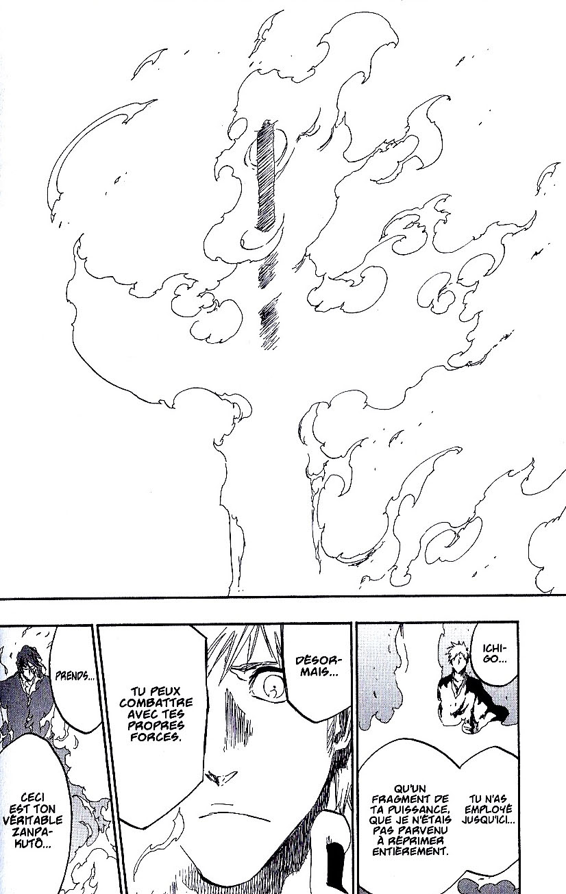 Sachant que plus la lettre se rapproche de A (Yhwach), plus celui-ci est puissant. Hm, oui, pourquoi pas. Quoiqu’il en soit, on revoit ENFIN Zangetsu et on comprend désormais un peu mieux pourquoi celui-ci ressemblait physiquement au chef des Quincy Yhwach (ou Juha Baach). Zangetsu est la source intérieure des pouvoirs Quincy d’Ichigo. Or, Yhwach EST la source.