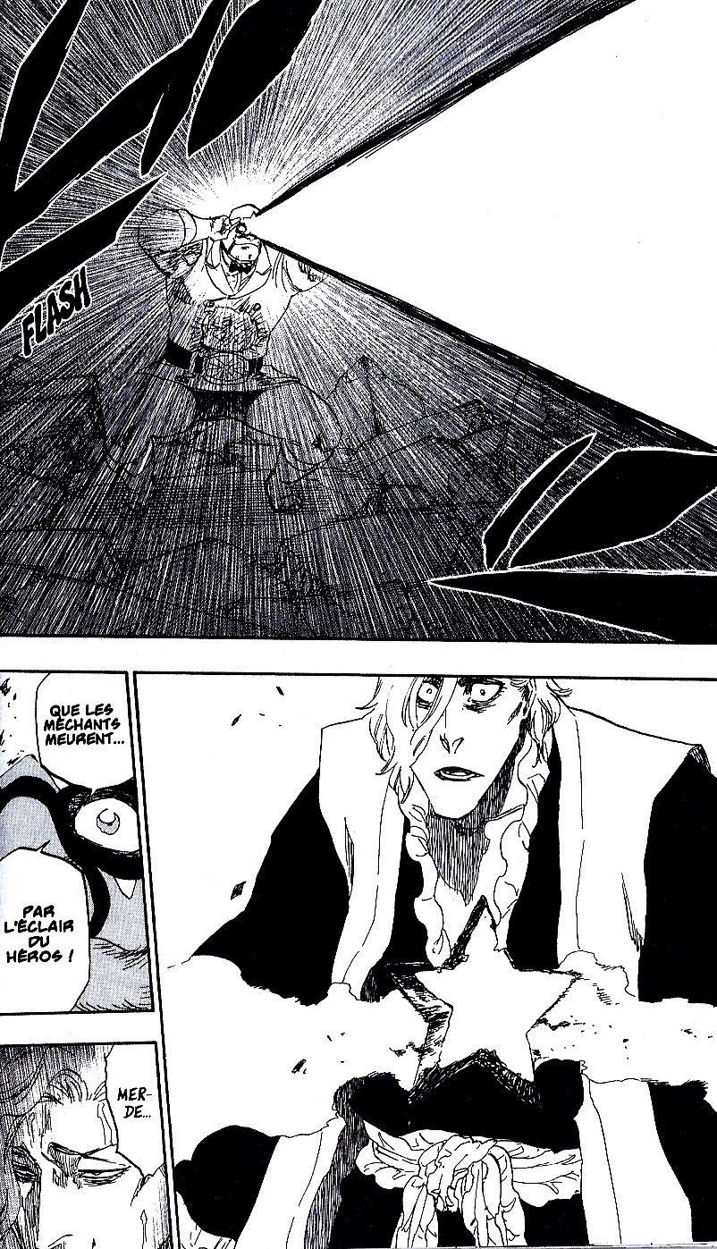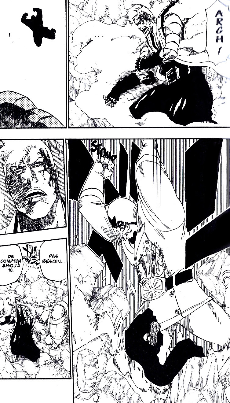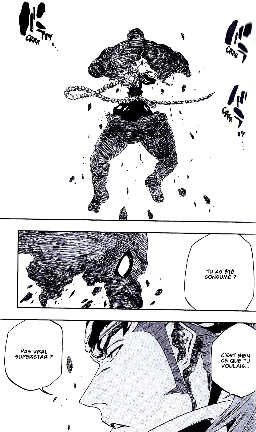 Heureusement que les persos ont encore un minimum de classe, à commencer par Renji Abarai VS Superstar et Rukia Kukichi VS Äs Nödt, mais pourquoi Kubo s’acharne t-il à en humilier la plupart ? Ici, je parle évidemment du binôme Kensei/Rôjurô qui ne se fait pas du tout respecter. Les deux ont un niveau de capitaine, on ne les a JAMAIS vu être sérieux depuis leur introduction il y a de ça quelques années…et ils se font terrassés comme des m*rdes par le plus random des adversaires random. C’est tout simplement honteux et très embarrassant pour les fans (si tant qu’il y en est) de ces persos.