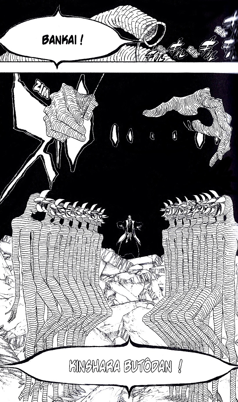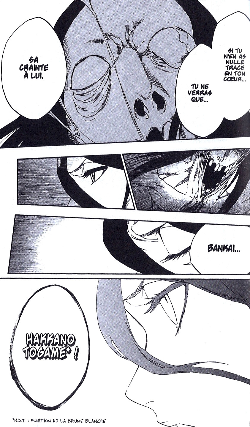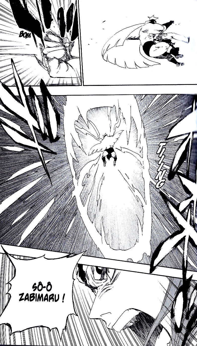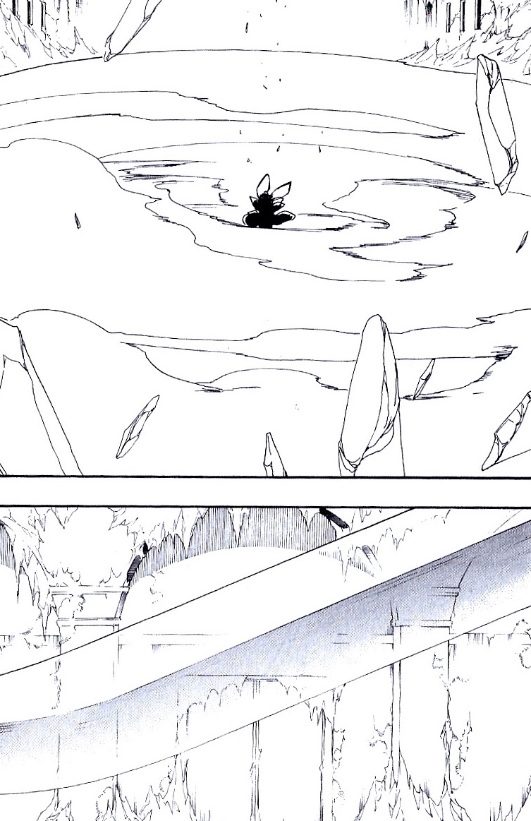 Je veux bien que l’auteur tente, tant bien que mal, de démontrer la puissance des ennemis ultimes de Bleach mais quand même, ça ne justifie pas une telle humiliation. Tout ça pour que Renji ait son heure de gloire…et là encore, quelle lenteur interminable ._. Du coté du combat Rukia VS Äs Nödt, c’est déjà un peu mieux : Byakuya se contentant d’une mini entrée badass mais laissant rapidement la part belle à sa soeur et son superbe bankai de glace <3 Puis ça fait plaisir de les voir enfin réunis ces deux-là :3