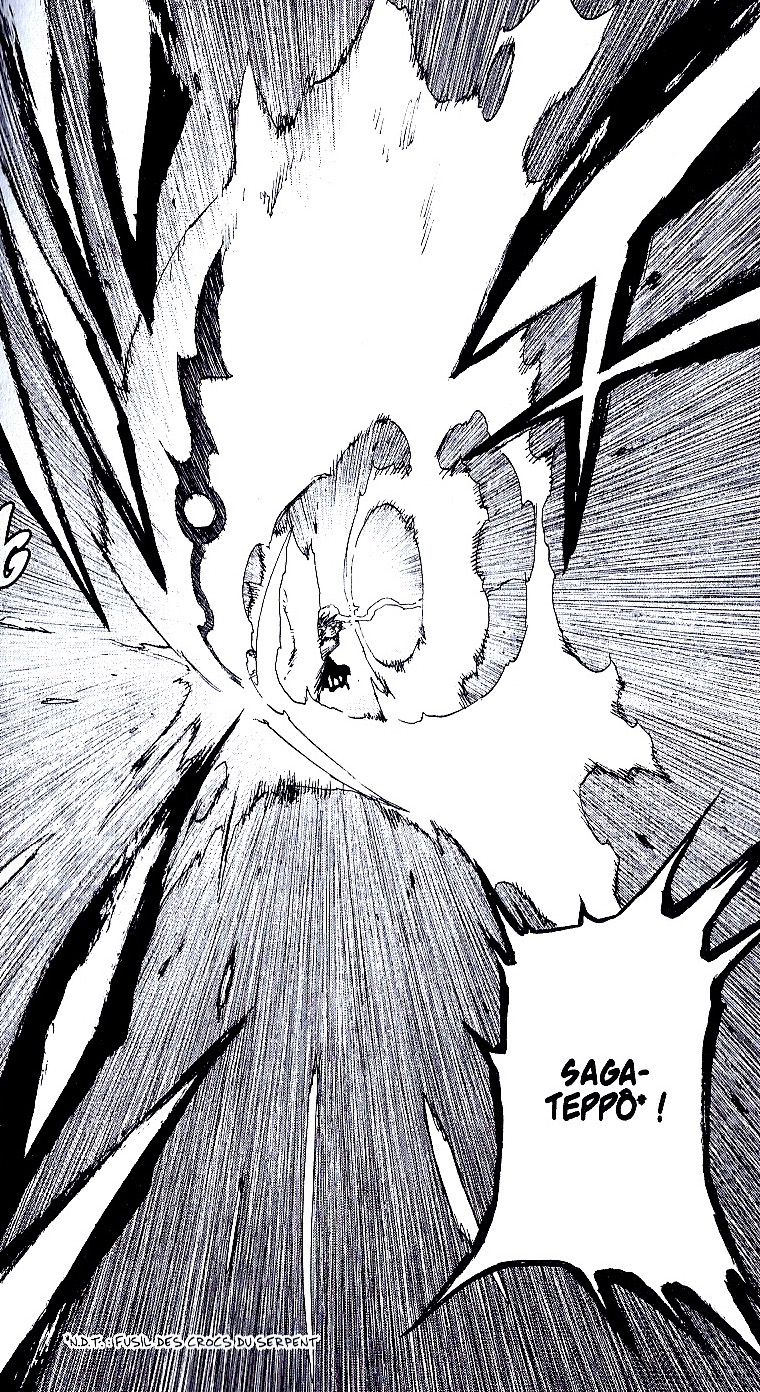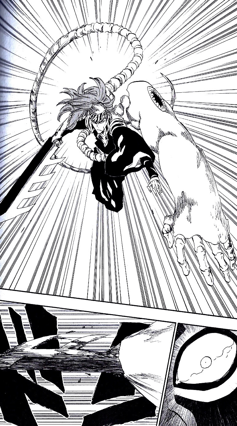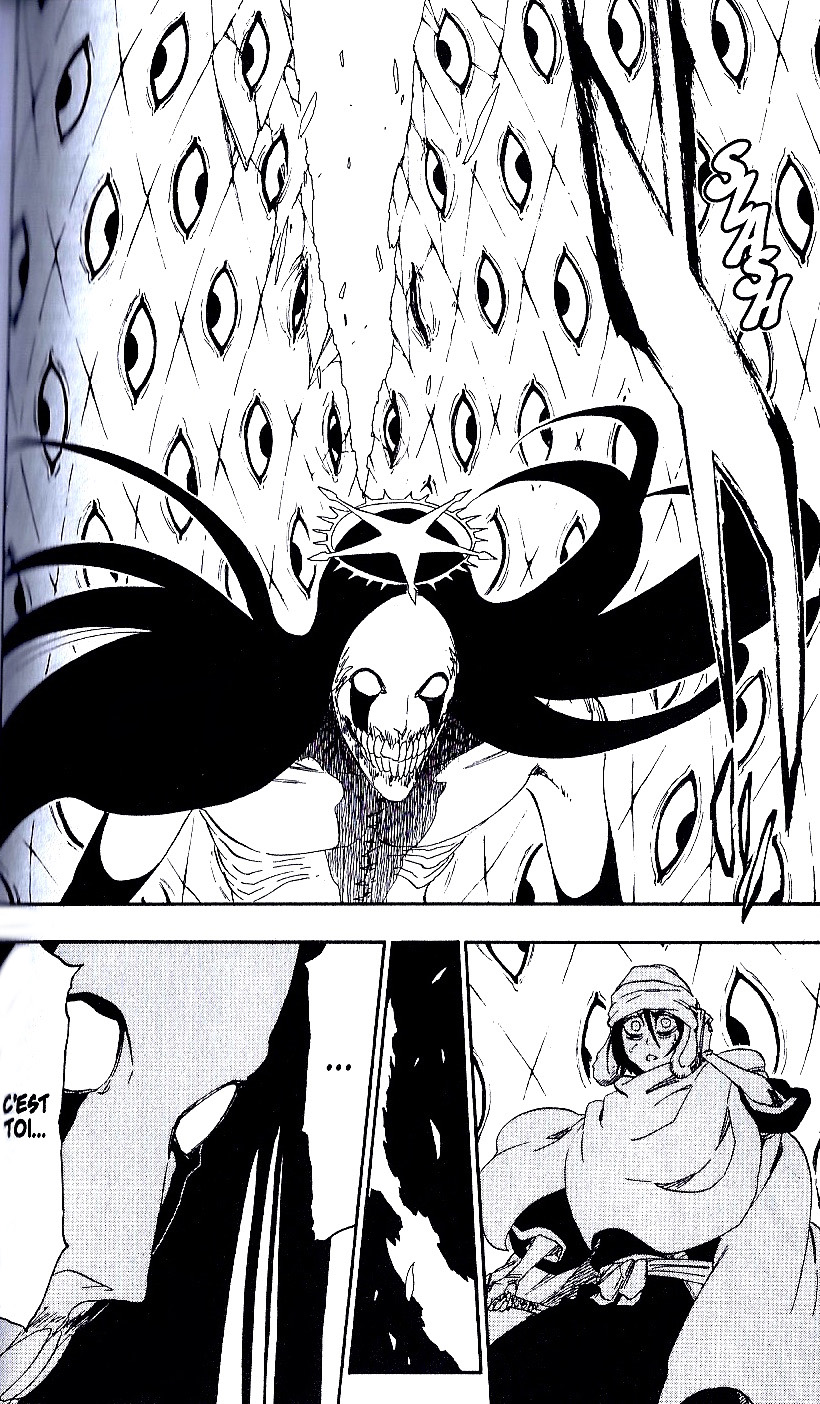 Je veux bien que l’auteur tente, tant bien que mal, de démontrer la puissance des ennemis ultimes de Bleach mais quand même, ça ne justifie pas une telle humiliation. Tout ça pour que Renji ait son heure de gloire…et là encore, quelle lenteur interminable ._. Du coté du combat Rukia VS Äs Nödt, c’est déjà un peu mieux : Byakuya se contentant d’une mini entrée badass mais laissant rapidement la part belle à sa soeur et son superbe bankai de glace <3 Puis ça fait plaisir de les voir enfin réunis ces deux-là :3
