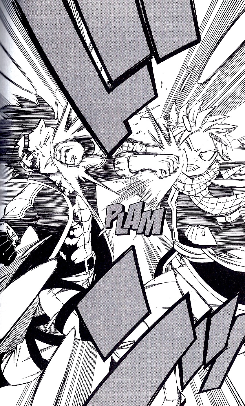 Peu à peu, nous retrouvons nos héros un an après la victoire contre Tartaros…et force est de constater que beaucoup de choses ont changé ! À commencer par Natsu qui semble avoir hérité d’un power-up monstrueux : en témoigne son one-shot contre Blue Note le sous-chef de Grimoire Heart. Un homme contre lequel Natsu n’avait rien pu faire à l’époque : l’indétronable Gildarts s’était du coup occupé de son cas. Natsu serait-il lui-aussi devenu un monstre ? Il faut le croire !