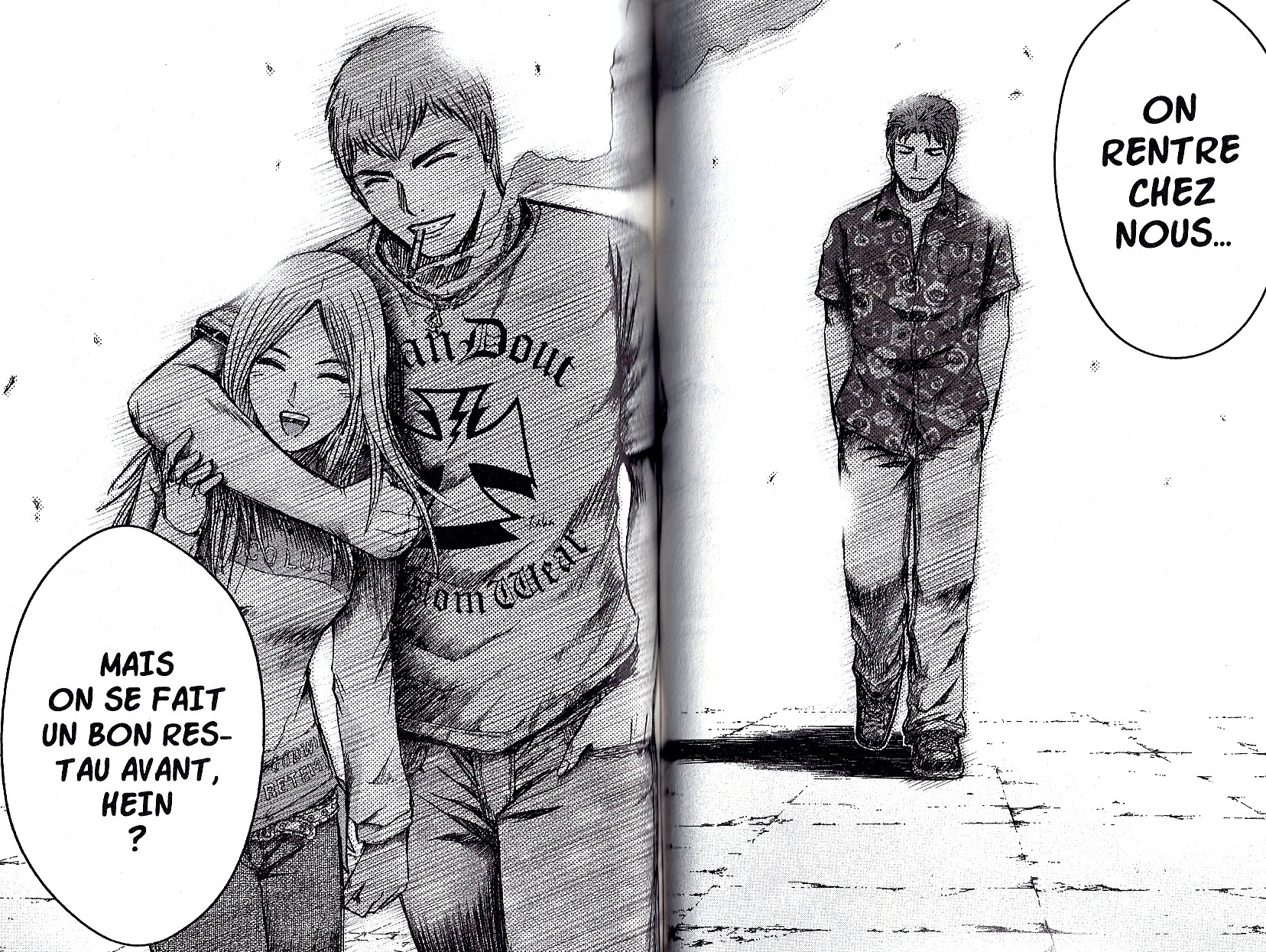 Vraiment dommage qu’aucune piste scénaristique ne soit développée : quid de la relation Shinomi/Onizuka qui traine depuis Young GTO ? Quid des aventures amoureuses d’Onizuka : est-il vraiment condamné à être puceau toute sa vie ? Quid des autres lascars de Young GTO ? Presque rien ne nous est raconté alors qu’il y aurait eu matière à. Au lieu de ça, Tôru Fujisawa a préféré concevoir des arcs qui se ressemblent et s’assemblent. On ne pourra donc s’empêcher de réprimer un sentiment de déception face au gâchis de cette série qui contenait pourtant beaucoup de potentiel. Petite surprise ceci-dit : l’épilogue, qui pourrait s’intituler « La relève d’Onizuka » est assez original (à défaut d’être marrant).