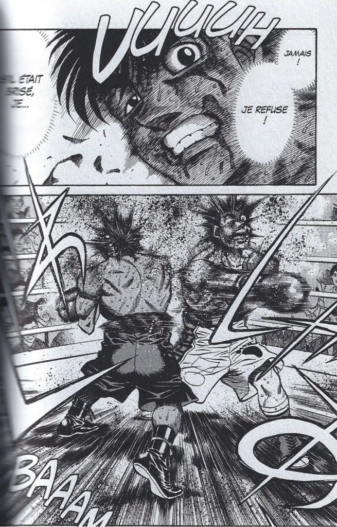 Mais Ippo a bien préparé son match à travers un entraînement spartiate qui en ferait frémir plus d’un ! Concrètement, Ippo arrive sur le match avec un dos tout en acier trempé et surtout une capacité respiratoire décuplé !