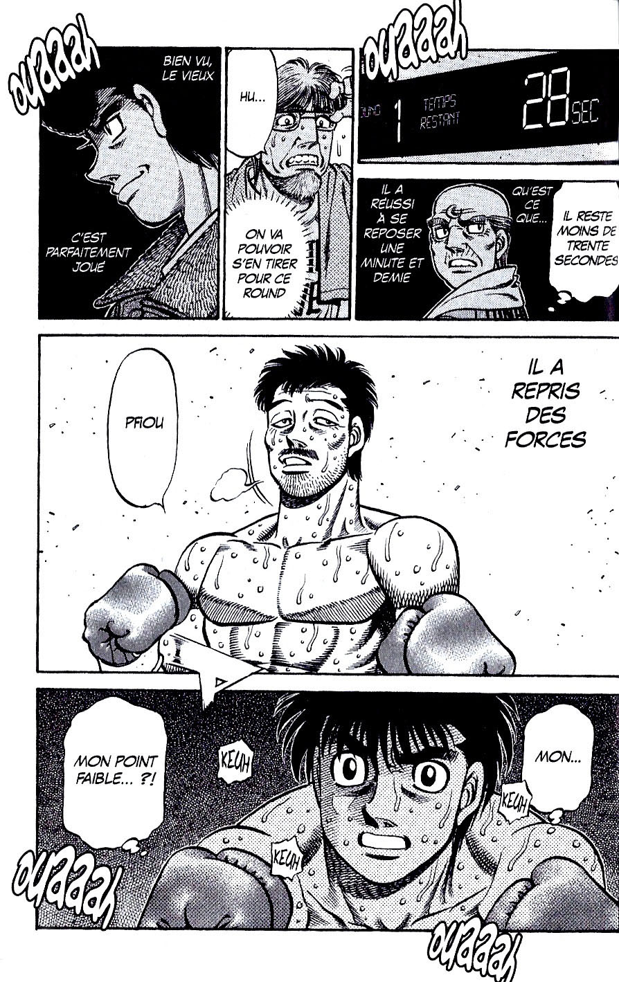En tout cas, force est de constater qu’il est solide vu le down qu’il se prend en pleine poire 😮 Et très malin aussi : n’hésitant pas à accrocher Ippo pour regagner des forces. Aoki, prends- en de la graine ! Anyway, ça serait bien qu’on reparte du coté de Miyata et, surtout, Sendo qui n’a eu le droit à aucun gros combat depuis le titre mondial VS Ippo. Alors que Miyata oui -_-