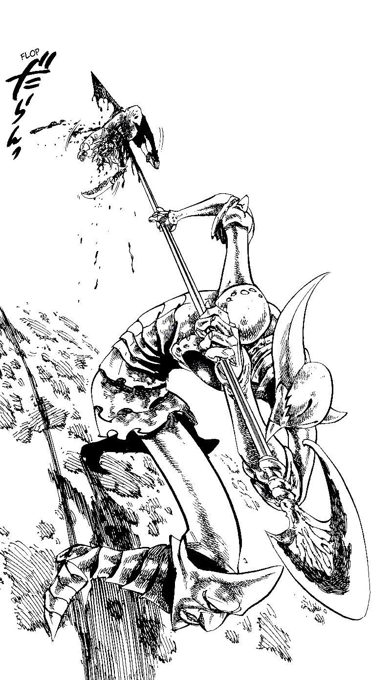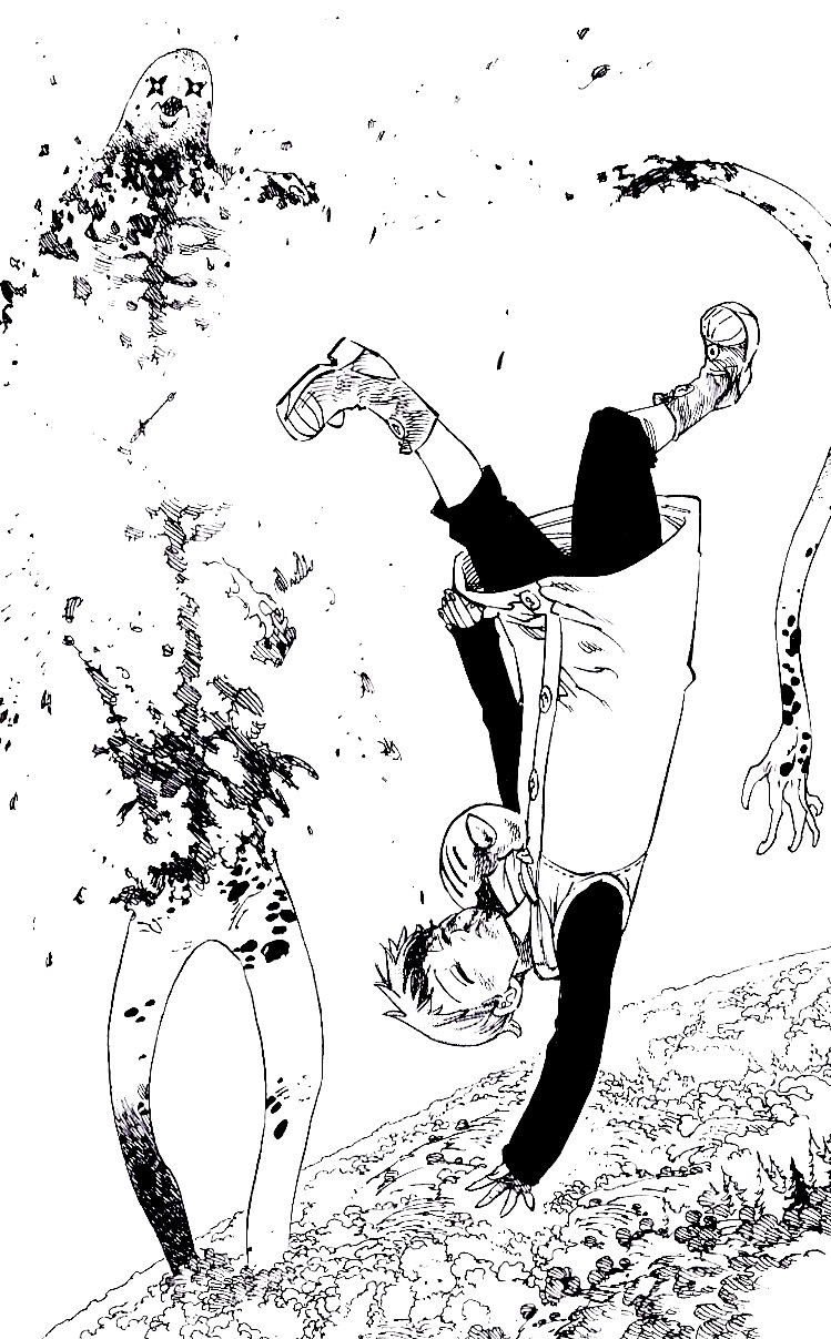 Comme quoi les Seven ont de la ressource sous le coude ! Pour autant, difficile de se réjouir lorsqu’on assiste, quelques chapitres plus tard, à la boucherie délivrée par Galan à l’encontre de Meliodas, Diane, Merlin et toute l’armée de Camelot. C’est simple : personne ne lui arrive à la cheville et cela alors même que sa magie est à 0 points —> le sceau des déesses qui a, jadis, emprisonné les 10 faisant encore temporairement effet. Sa puissance brute ? 26.000 points. Et une cruauté qui n’a aucune limite.