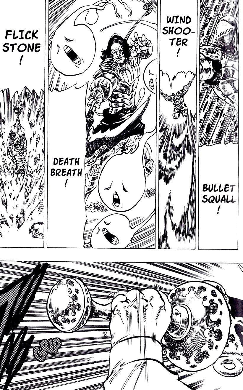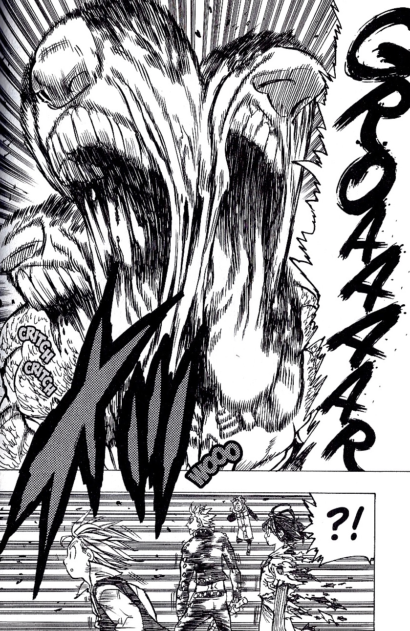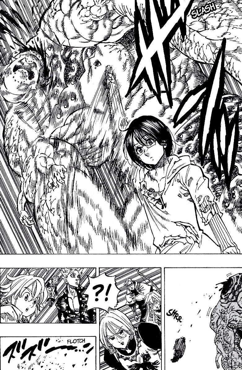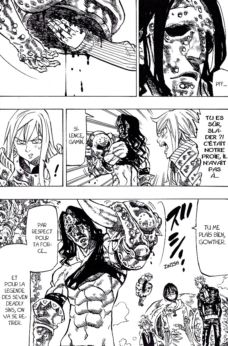 Le voilà enfin : l’incontournable, l’immanquable, le formidable Gowther \o/ Et personne jusqu’alors parmi Melodias, Diane, Ban et King n’avaient vu son visage. Dis donc ! Mais l’heure n’est pas aux retrouvailles car le curieux compagnon de Gowther, malgré sa récente décapitation, semble plus que jamais en fureur. Serait-il possible qu’il s’agisse d’un démon ? Mais dans ce cas, pourquoi Meliodas entend-il des appels à l’aide provenant de la seule partie humaine restante du golem ? « Peu importe ! » hurle Ban, « Je vais mettre un terme à ses souffrances une bonne fois pour toutes ».