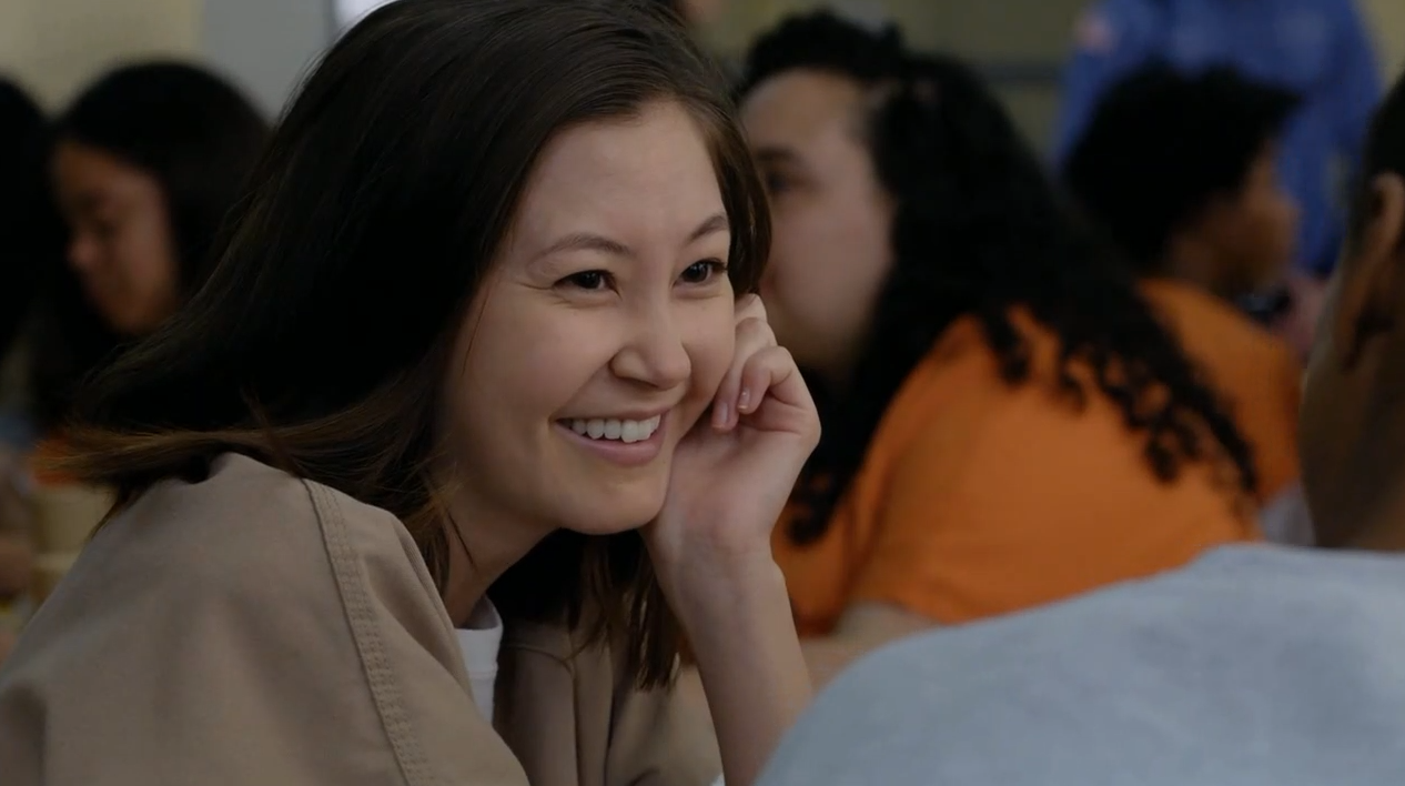 La Montagne qui s’énerve parce qu’il a un nom imprononçable et que tout le monde se trompe xD Poussey qui crie « Judy Kingggg » chaque fois que Caputo prend la parole xDD D’ailleurs, en parlant de la louve, inutile de préciser que celle-ci a le droit à un traitement VIP du fait de son statut ! À savoir que Mme King a des relations très bien placées dans l’administration publique et que le secteur pénitencier ne fait pas exception ! Caputo a bien intérêt à la choyer comme il faut le temps qu’elle boucle sa peine… En tout cas, je crois que je l’aime bien ! La manière dont elle remet à sa place ce raciste de Sam (-‸ლ)