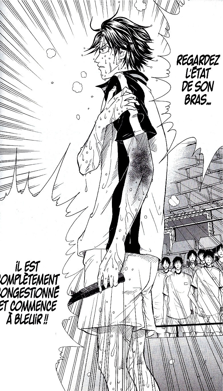 Quant à Echizen, celui-ci demeure introuvable et c’est à Momo qu’incombe la charge de le retrouver avant son match. Retour au plat de résistance : Sanada attaque très fort avec sa technique Fûrinkazan lui permettant de frapper comme la foudre mais Tezuka n’a pas dit son dernier mot et est prêt à tout pour remporter la premier victoire de son équipe. Quitte à y laisser son bras.