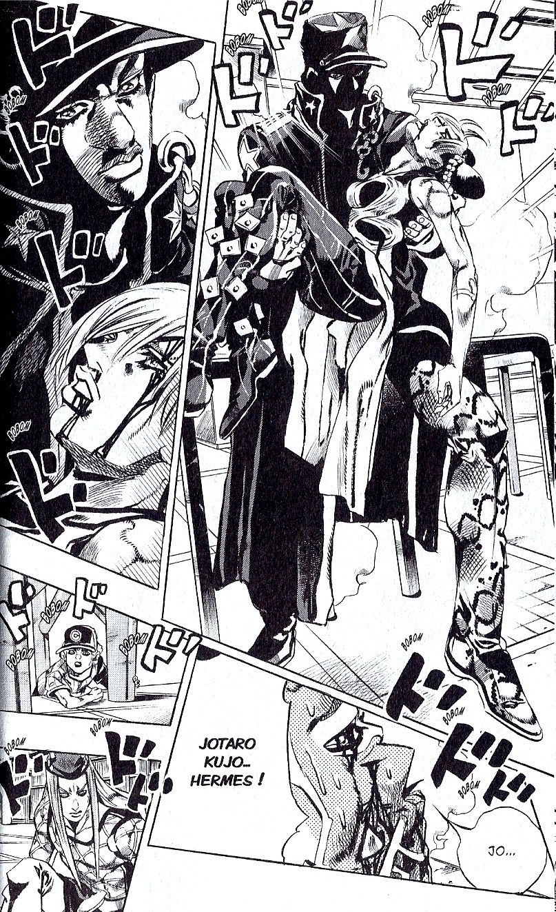 Jolyne Kujo a enfin réussi à trouver la parade contre le stand C-Moon du père Enrico Pucci mais ce dernier déborde de ressources et parvient encore une fois à s’en sortir. Et alors qu’il s’apprête à donner le coup fatal à Jolyne, ses amis, accompagnés de son patriarche Jotaro Kujo, débarquent pour la sauver d’une mort certaine.