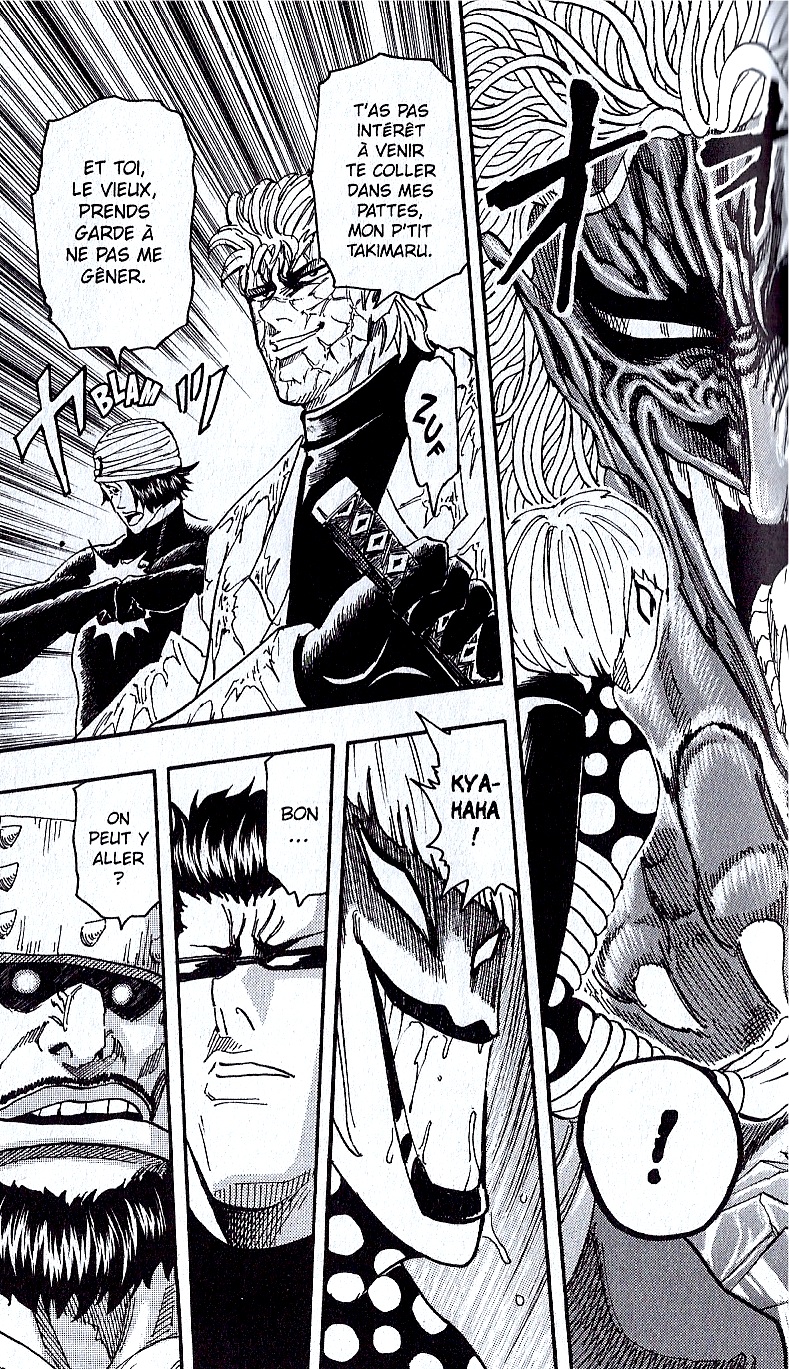 Tome principalement axé combat, on ressort une nouvelle fois satisfait de la lecture et cela notamment grâce à l’introduction des nouveaux personnages. Entre le vice-chef des gourmets yakuzas Match et son code de l’honneur respectable ou encore le chevalier servant Takimaru, chacun des deux « gentils » nous offrent une introspection courte mais nécessaire sur leurs motivations et leurs caractères. Conséquences : on s’attache davantage à eux.