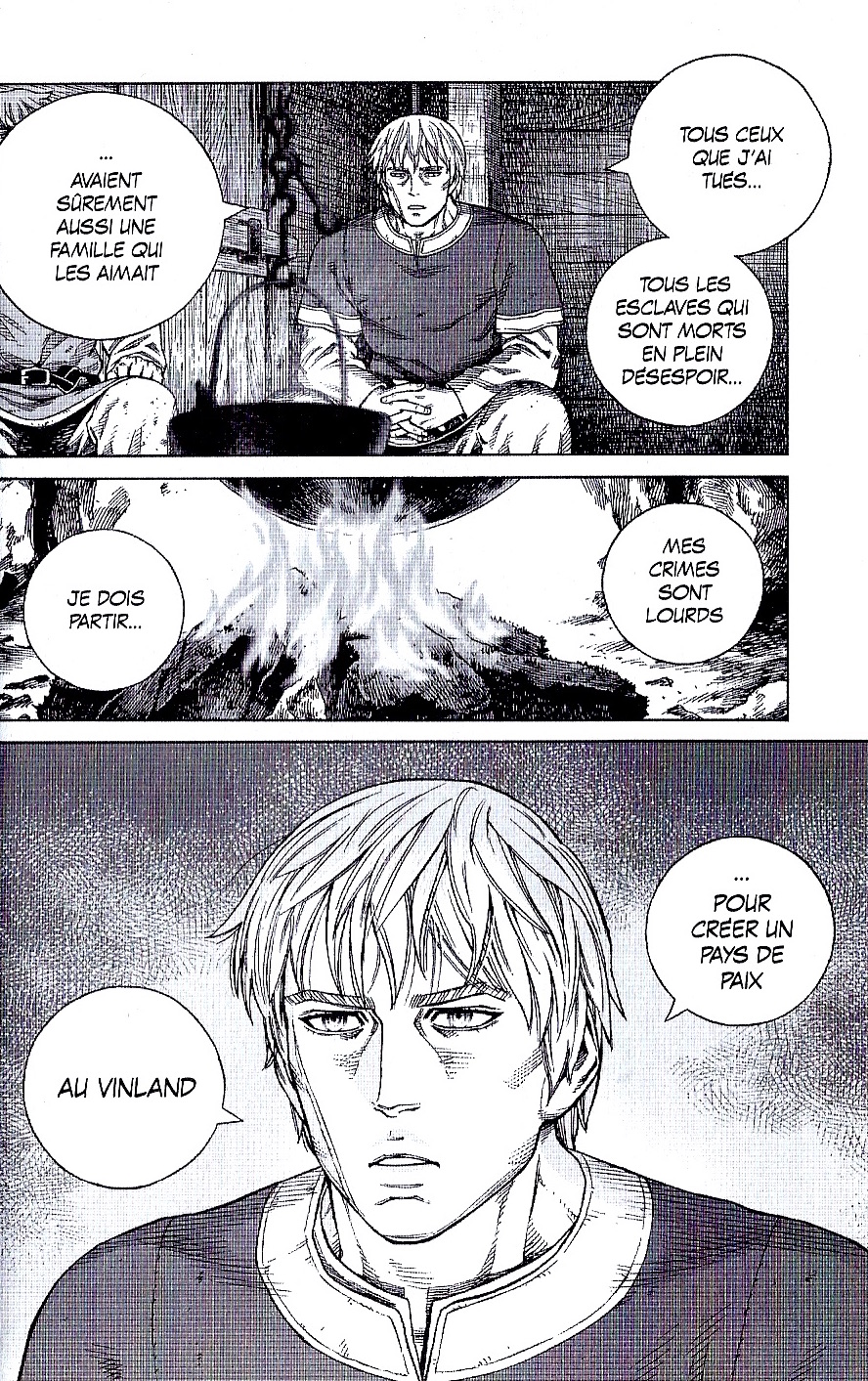 Depuis qu’il est rentré au bercail, Thorfinn réfléchit de plus en plus à la manière dont il va s’y prendre pour conquérir le Vinland. Soit cette terre lointaine et sacrée qui regorgerait de ressources premières et autres terres fertiles n’attendant que d’être défrichées. Oui, c’est là-bas que Thorfinn parviendra à créer un pays suffisamment riche et sain pour ne jamais être corrompu par la haine et la douleur. Peut-être, alors, arrivera-il à trouver un semblant de paix après tous les crimes qu’il a commis. Seulement voilà, avant même de penser à coloniser le Vinland, il va lui falloir trouver des sous pour l’expédition. Beaucoup, énormément de sous.