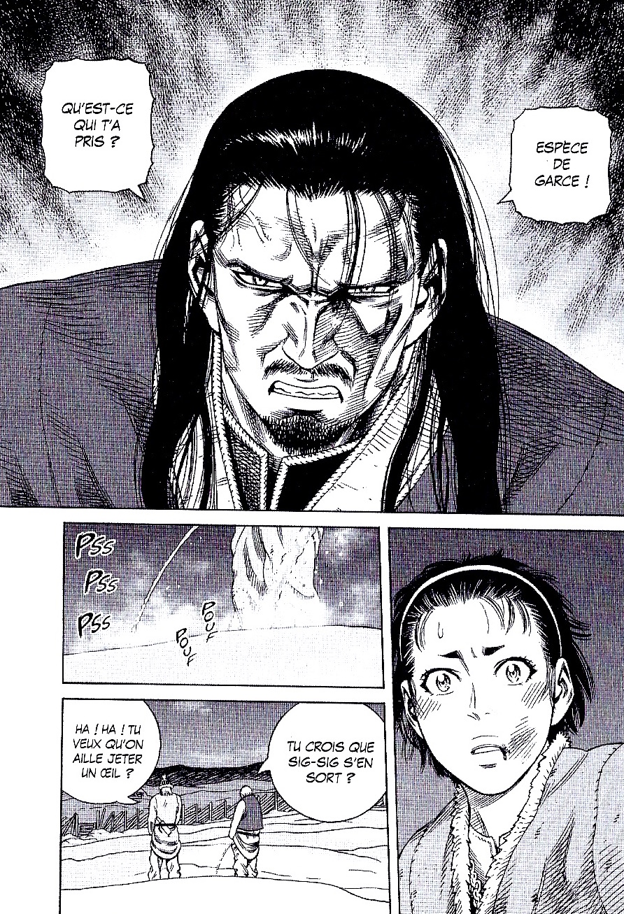 Et heureusement qu’elle est là car c’est peu dire qu’elle permet à ce tome, très lent dans le rythme, d’échapper à une certaine torpeur. Voilà ce qu’on appelle avoir du talent en écriture (-‸ლ) Domaine dans lequel Makoto Yukimira excelle depuis la nuit des temps (il serait d’ailleurs temps que je lise sa précédente oeuvre « Planetes »). J’espère simplement que la revente des fameuses « cornes de licorne » par Thorfinn, Einar et ce vieux roublard de Leif sera terminée d’ici le prochain tome. Histoire qu’on arrive ENFIN à la conquête du Vinland. Terre qui se fait désormais appeler « États-Unis d’Amérique », huhu. Allez, là !!!