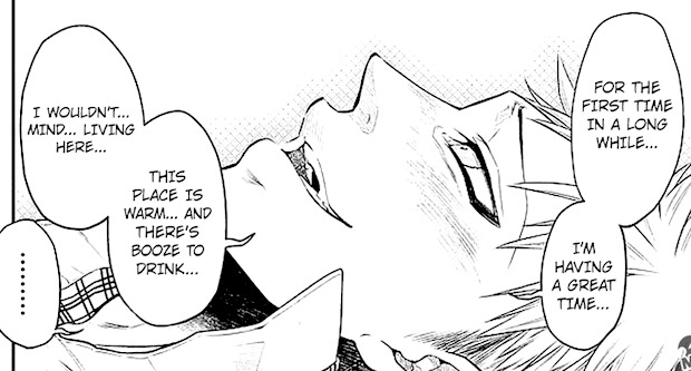 Ils sont troppppp choux !! Évidemment que Ban allait aider Papa Champignon à récupérer son petiot ! Histoire que la Mushroom Family soit au complet (-‸ლ) Par contre, Ban-chan est totalement à l’ouest quand il pense que ce sont tous des frères !! Bref… Il ne manque plus qu’à Elaine et Ban de s’embrasser ! Est-ce que ça arrivera le 5e jour ? Le 6e ? Voire le 7e histoire de nous faire pleurer un max T_T Encore un mois à attendre ! Et voui –> Mamoru Iwasa a profité ce ce chapitre intermédiaire pour remettre les compteurs à zéro ! Tss… En tout cas, j’espère qu’on reverra Elaine dans le manga ! Elle avait ressuscité pendant un court moment mais ça n’avait pas duré —> Ban ayant fini par tuer Merascylla a.k.a. la Ten Commandment responsable de son « retour à la vie »…. Courage, Ban-chan (`0´)/