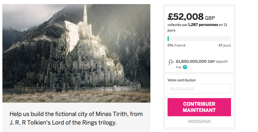 Même si le troisième volet était assez sympa puisqu’un minimum rythmé. Mais les deux premiers… O_O Aussi longs que les LotR (Lord of The Rings) mais sans le coté épique/dramatique qui va avec. Autant dire que j’avais l’impression d’assister à une colonie de vacances entre un hobbit et des nains. Avec Gandalf dans le rôle du directeur pédophile. C’était assez embarassant. Anyway, si vous souhaitez soutenir le projet de fou de cette équipe d’architectes anglais menée par Jonathan Wilson, n’hésitez pas à leur filer 5 € sur leur page Indiegogo. Sachant qu’ils doivent réunir…£1.850.000.000. Ha quand même.