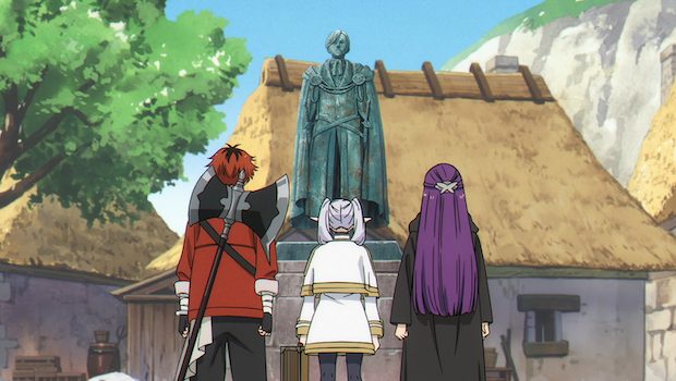 « Voudriez-vous bien polir la statue du héros ? » demande un vieil homme à la petite troupe. « Et la récompense ? » lui répond Frieren. « Un sort qui permet de se gratter le dos dans les endroits les plus sensibles ». Deal ! 29 années se sont passées depuis la mort de Himmel, le héros, et force est de constater que sa réputation n’a pas pris une poussière. Forcément, vu que ses statues sont polies. Huhuhu. « J’aime bien faire ce genre de petit boulot ! » réalise Stark. Mais alors que nos trois comparses s’apprêtent à effectuer leur besogne, voilà que la statue en question… porte une moustache ?! « Mais c’est pas Himmel ?! ». « Nope » lui fait savoir Frieren. « Il s’agit du Héros du Sud ». « Hm ? » s’interpellent Fern et Stark. « Himmel a vaincu le Roi Démon mais il ne fut pas le seul héros ». Parmi eux, cette figure réputée pour être l’humain le plus fort de l’histoire. À l’époque, il avait affronté les Sept Sages de la Destruction qui contrôlaient alors les régions du nord. « Nous n’en avons vaincu que deux, deux autres ont pris la fuite et cet homme a vaincu les trois restants ». Et beh.