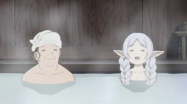 Fern hésite. Que mettre pour son premier rendez-vous galant. « Frieren-sama ? ». « Quelle différence ça ferait ? » s’interroge l’intéressée. « Tu peux me coiffer avant de partir ? ». Pas étonnant que la séance de coiffure ait, par la suite, tourné à la torture. « Aie ! » se lamente Frieren. « Je m’excuse ! Ne tresse plus mes cheveux muée par la colère ». Ha… Quoiqu’il en soit, un choix fut pris. Il est temps de prendre les devants. […] « On y va ? » demande Stark. « Oui ». « Tu ne portes pas tes habits habituels, pourquoi ? ». « Parce que c’est un rendez-vous ». « Ho ». Reste à savoir comment se comporter en de pareilles circonstances. Une chose est sûre, Stark n’est pas indifférent au charme de Fern. « Elle a toujours été aussi mignonne ? ». Enfin ! Premier étape : la place du marché. « Frieren la visite souvent ». « Oui » répond Stark. « Elle dit souvent que les places de marché regorgent d’objets magiques inhabituels ». « C’est pour ça que sa chambre est un fatras sans nom ». « Ha ha ! ». Un peu loin, Frieren aurait pu éternuer si elle n’avait pas baigné dans un onsen de premier choix.