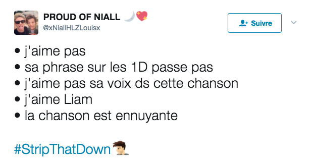 Certes, Liam voulait avant tout pointer du doigt le management facho qui les a fait fuir un par un (à commencer par Zayn). Mais il aurait pu s’y prendre autrement vu que beaucoup d’ex-directioners l’ont pris pour elles u_u Anyway ! Si je devais faire un classement des garçons en solo, je mettrais Zayn en 1er. Puis Harry (même si je suis pas fan de son style, ça reste SON style). Suivi de Niall, Louis et loin derrière Liam xD Globalement, je dirais que Zayn et Harry sont ceux qui ont le plus de potentiel ! Louis et Niall peuvent se démarquer en affirmant leur potentiel. Mais Liam… Si son album reste dans la même veine que Strip That Down, je prédis le semi-bide .-. Soit le type essaye de se créer un profil « Rappeur pop à minettes » qui ne lui va pas. Soit il est vraiment comme ça et là…
