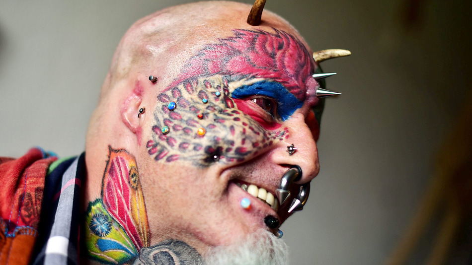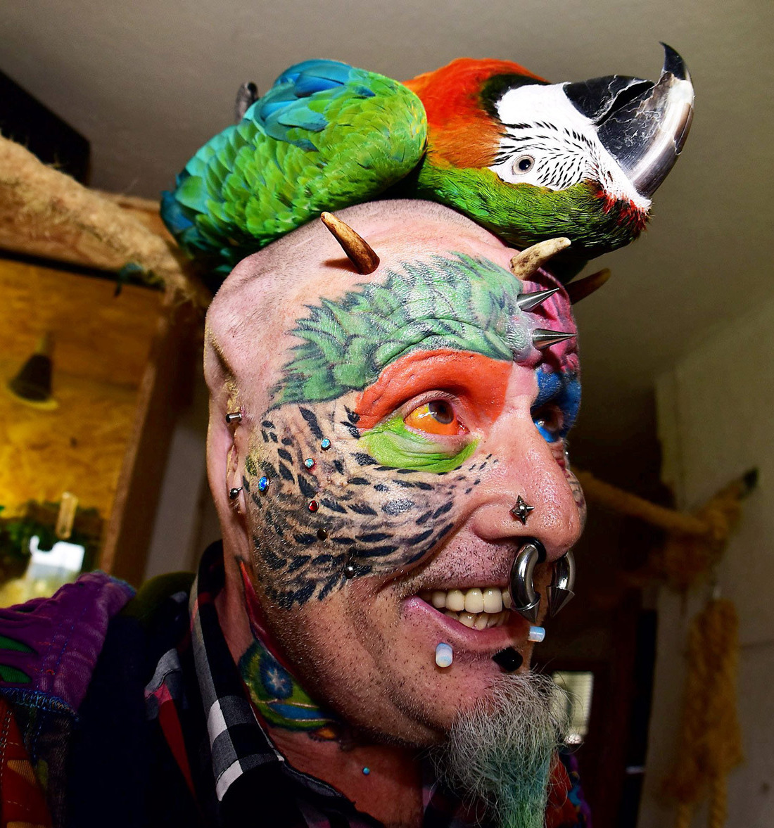 De là à dire que son suicide et ses opérations de l’extrême sont liées, il y a un pas que je m’abstiendrais de franchir. Quoiqu’il en soit, Ted Richards, 56 ans (UK), partage ce désir de « fusionner » avec son animal fétiche. Ici, le perroquet. Ou plutôt SON perroquet domestique de 5 ans. Plumes colorées tatouées sur tout le visage, piercings au nez et sur le front, injection d’encre dans les yeux (wtf) et, enfin, amputation des oreilles. Même s’il semblerait que les canaux auditives n’aient pas été affectés afin que Ted puisse continuer à entendre. Son prochain objectif ? Se faire opérer du nez afin que celui-ci ressemble à un bec ._. Damn.