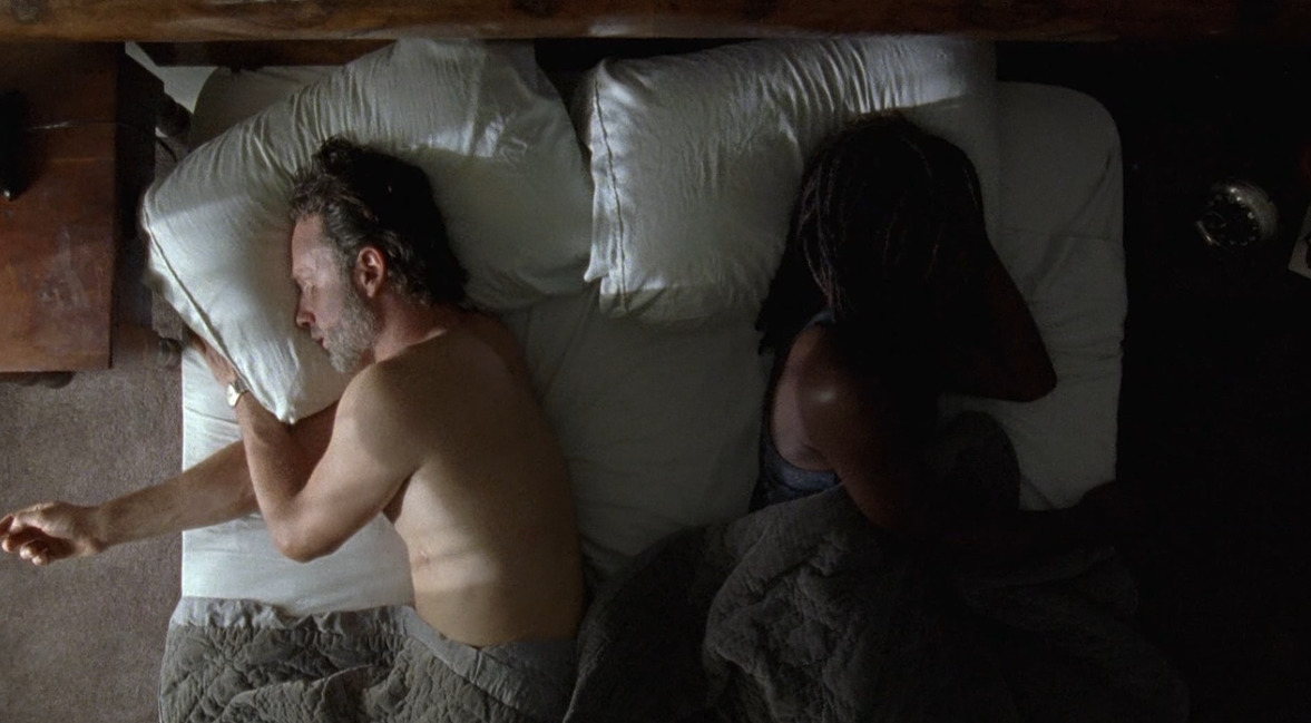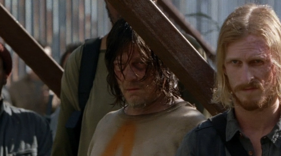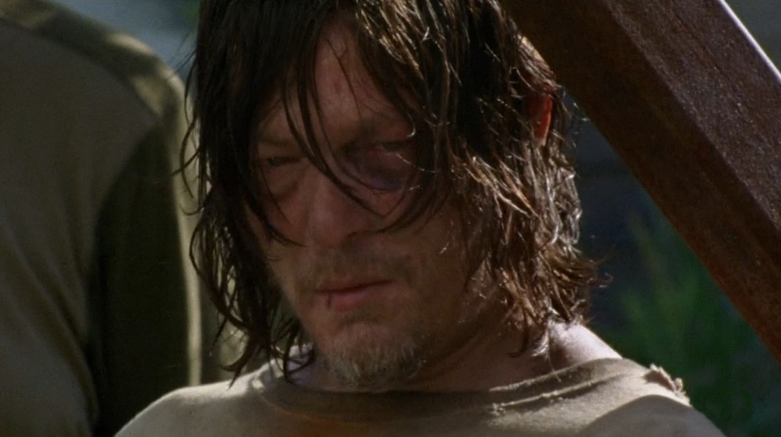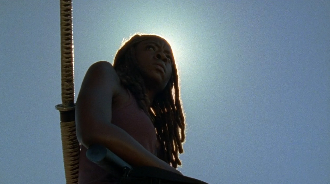 Depuis ce jour-là, tout a changé à Alexandria. Et Michonne a toujours autant de mal à trouver le sommeil. D’ailleurs, son sabre est à nouveau sur elle —> Signe qu’elle ne compte pas laisser Negan et sa bande de psychopathes faire leur loi. Mais a t-elle toujours le choix ? « Bien sûr que oui ! Et je le prouverai d’ici peu ». Pendant ce temps, le loup frappe à la bergerie. Parce qu’il est l’heure de réclamer son dû. Et bien sûr, un loup ne serait rien sans sa meute. Une meute dans laquelle se trouve un loup solitaire en bien piteux état. « Mon dieu, qu’est-ce qu’ils t’ont fait, Daryl ? » ne peut s’empêcher de penser Rick en voyant l’état pitoyable de son ami. « Hop, hop, hop ! Allez, ma poule ! Il est l’heure de t’acquitter de ta redevance ! ».