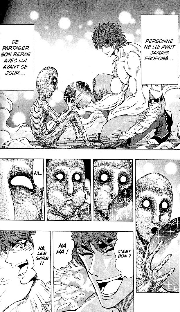 Ainsi rejoint-il ses frères, Ichiryu et Jiro ! Sans oublier la belle Frohze. Et Acacia ! Au final, on apprend que la Légende Gourmet n’avait pas d’autre choix que de jouer les méchants. Son appétit, Neo, était devenu incontrôlable. La seule manière de le calmer était de lui infliger des coups pétris de colère. D’où ce manège orchestré afin que Midora et Toriko aient la rage comme pas possible. Pour autant, Acacia avait fait le pari que Toriko ne déchargerai pas toute sa colère sur Neo ! Histoire de lui offrir une deuxième chance en partageant un repas. Chose qu’on ne lui avait jamais proposé jusqu’alors… Nous nous retrouvons donc avec une Happy End, certes, mais chargée d’un minimum de conséquences dramatiques. Avec les morts de Jiro et Midora. Quid des Huit Souverains et de Starjune ? Center, le hors d’oeuvre du menu idéal de Acacia, s’est chargé de remettre tout le monde sur pied ! Merci à Aimaru pour l’avoir déniché au péril de sa vie !
